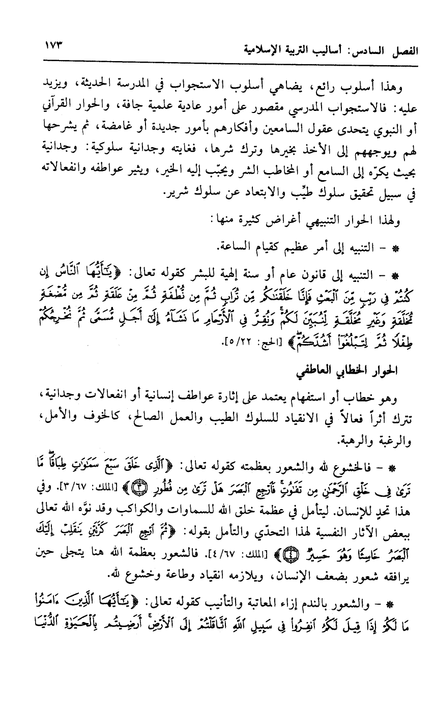 وهذا أسلوب رائع، يضاهي أسلوب الاستجواب في المدرسة الحديثة، ويزيد عليه: فالاستجواب المدرسي مقصور على أمور عادية علمية جافة، والحوار القرآني، أو النبوي يتحدى عقول السامعين، وأفكارهم بأمور جديدة أو غامضة، ثم يشرحها لهم ويوجههم إلى الأخذ بخيرها وترك شرها، فغايته وجدانية سلوكية: وجدانية بحيث يكره إلى السامع أو المخاطب الشر، ويجيب إليه الخير، ويثير عواطفه وانفعالاته في سبيل تحقيق سلوك طيب، والابتعاد عن سلوك شرير.