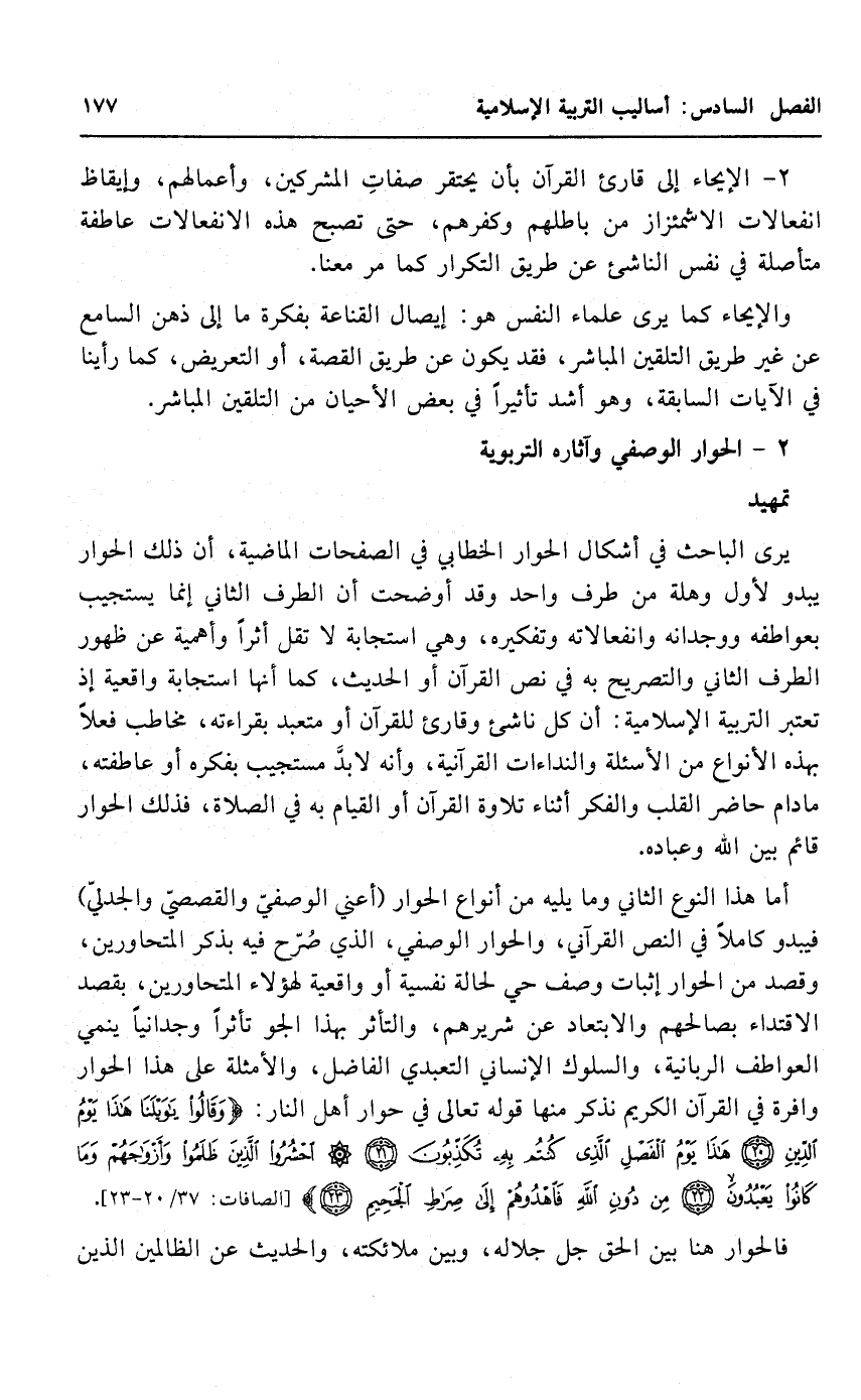 أما هذا النوع الثاني، وما يليه من أنواع الحوار "أعني الوصفي والقصصي والجدلي"، فيبدو كاملا في النص القرآني، والحوار الوصفي، الذي صرح فيه بذكر المتحاورين، وقصد من الحوار إثبات وصف حي لحالة نفسية، أو واقعية لهؤلاء المتحاورين، بقصد الاقتداء بصالحهم، والابتعاد عن شريرهم، والتأثر بهذا الجو تأثرا وجدانيا ينمي العواطف الربانية، والسلوك الإنساني التعبدي الفاضل، والأمثلة على هذا الحوار وافرة في القرآن الكريم نذكر منها قوله تعالى في حوار أهل النار: {وَقَالُوا يَا وَيْلَنَا هَذَا يَوْمُ الدِّينِ، هَذَا يَوْمُ الْفَصْلِ الَّذِي كُنْتُمْ بِهِ تُكَذِّبُونَ، احْشُرُوا الَّذِينَ ظَلَمُوا وَأَزْوَاجَهُمْ وَمَا كَانُوا يَعْبُدُونَ، مِنْ دُونِ اللَّهِ فَاهْدُوهُمْ إِلَى صِرَاطِ الْجَحِيمِ} [الصافات: 37/ 20-23] .