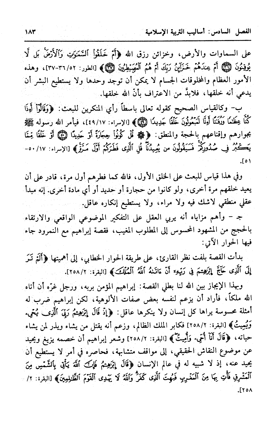 ج- وأهم مزاياه أنه يربي العقل على التفكير الموضوعي الواقعي، والارتقاء بالحجج من المشهود المحسوس إلى المطلوب المغيب، فقصة إبراهيم مع النمرود جاء فيها الحوار الآتي: