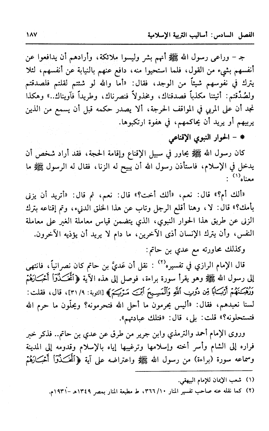 "ألك أم؟ " قال: نعم، "ألك أخت؟ " قال: نعم، ثم قال: "أتريد أن يزنى بأمك؟ " قال: لا"، وهنا أقلع الرجل وتاب عن هذا الخلق الدنيء، وتم إقناعه بترك الزنى عن طريق هذا الحوار النبوي، الذي يتضمن قياس معاملة الغير على معاملة النفس، وأن يترك الإنسان أذى الآخرين، ما دام لا يريد أن يؤذيه الآخرون.