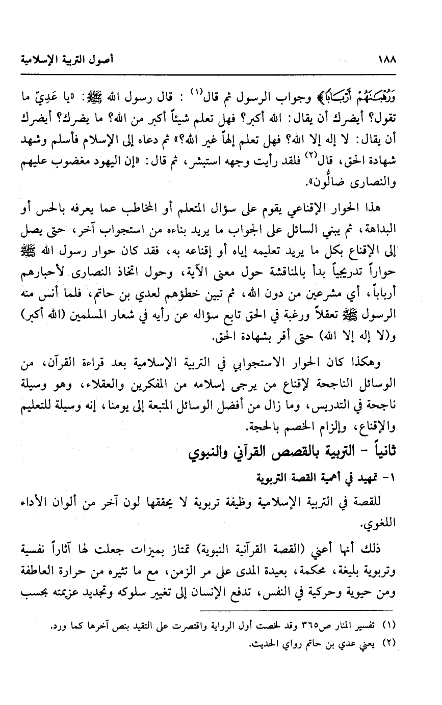هذا الحوار الإقناعي يقوم على سؤال المتعلم، أو المخاطب عما يعرفه بالحس أو البداهة، ثم يبني السائل على الجواب ما يريد بناءه من استجواب آخر، حتى يصل إلى الإقناع بكل ما يريد تعليمه إياه أو إقناعه به، فقد كان حوار رسول الله صلى الله عليه وسلم حوارًا تدريجيا بدأ المناقشة حول معنى الآية، وحول اتخاذ النصارى لأحبارهم أربابا، أي مشرعين من دون الله، ثم تبين خطؤهم لعدي بن حاتم، فلما أنس منه الرسول صلى الله عليه وسلم تعقلا، ورغبة في الحق تابع سؤاله عن رأيه في شعار المسلمين "الله أكبر" و"لا إله إلا الله" حتى أقر بشهادة الحق.