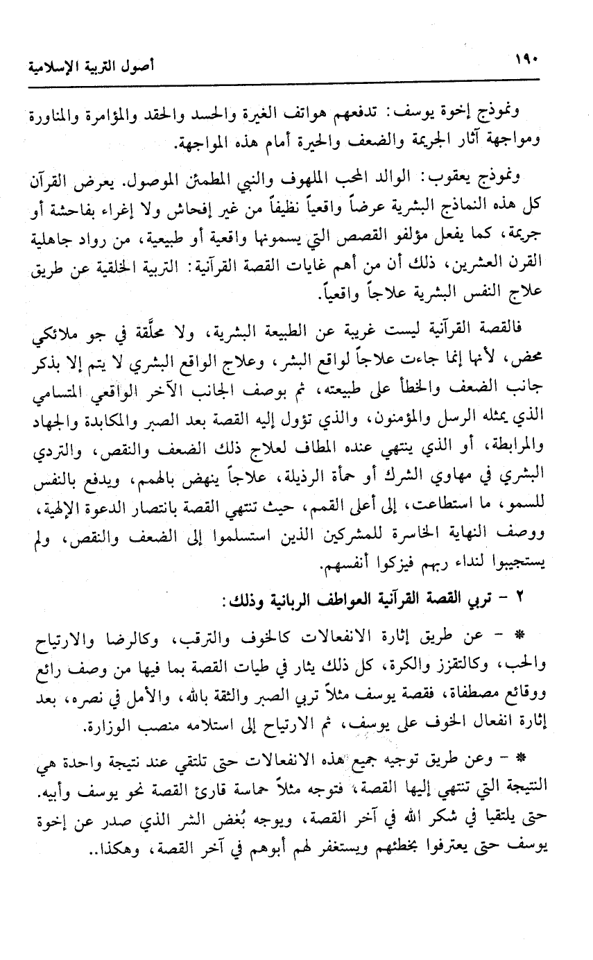 ونموذج يعقوب: الوالد المحب الملهوف والنبي المطمئن الموصول، يعرض القرآن كل هذه النماذج البشرية عرضا واقعيا نظيفا من غير إفحاش، ولا إغراء بفاحشة أو جريمة، كما يفعل مؤلفو القصص التي يسمونها واقعية أو طبيعية، من رواد جاهلية القرن العشرين، ذلك أن من أهم غايات القصة القرآنية: التربية الخلقية عن طريق علاج النفس البشرية علاجا واقعيا.