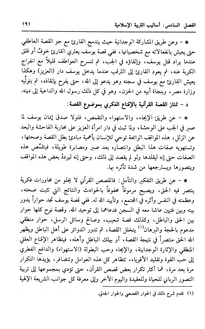 *- عن طريق التفكير والتأمل: فالقصص القرآني لا يخلو من محاورات فكرية ينتصر فيه الحق، ويصبح مرموقا محفوظا بالحوادث، والنتائج التي تثبت صحته، وعظمته في النفس وأثره في المجتمع، وتأييد الله له، ففي قصة يوسف تجد حوارا يدور بينه وبين فتيين عاشا معه في السجن فدعاهما إلى توحيد الله، وقصة نوح كلها حوار بين الحق والباطل، وكذلك قصة شعيب، وصالح وسائل الرسل، حوار منطقي مدعوم بالحجة، والبرهان1 يتخلل القصة، ثم تدور الدوائر على أهل الباطل، ويظهر الله الحق منتصرا في نتيجة القصة، أو يهلك الباطل وأهله، فيتظاهر الإقناع العقلي المنطقي والإثارة الوجدانية، والإيحاء وحب البطولة "الاستهواء"، والدافع الفطري إلى حب القوة وتقليد الأقوياء، تتظاهر كل هذه العوامل وتتضافر، يؤيدها التكرار مرة بعد مرة، فما أكثر تكرار بعض قصص القرآن، حتى تؤدي بمجموعها إلى تربية التصور الرباني للحياة، وللعقيدة واليوم الآخر، وإلى معرفة كل جوانب الشريعة الإلهية