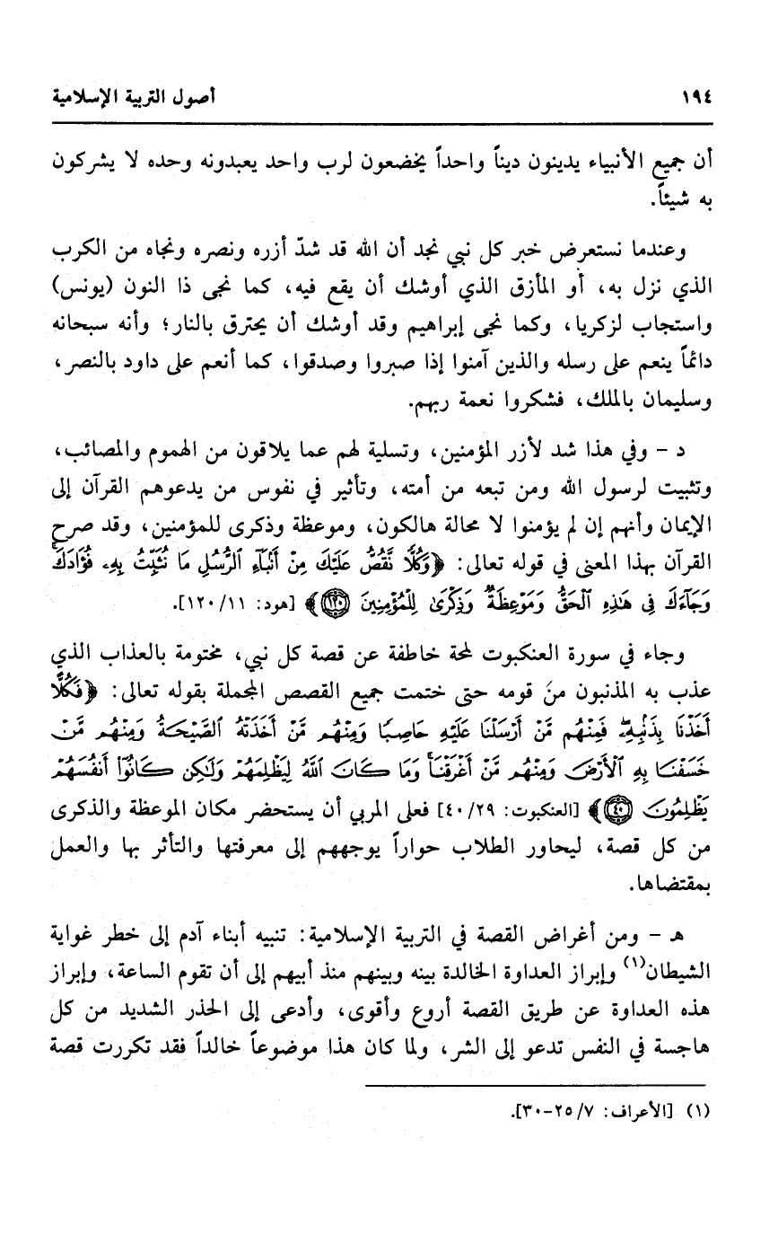 وجاء في سورة العنكبوت لمحة خاطفة عن قصة كل نبي، مختومة بالعذاب الذي عذب به المذنبون من قومه حتى ختمت جميع القصص المجملة بقوله تعالى: {فَكُلًّا أَخَذْنَا بِذَنْبِهِ فَمِنْهُمْ مَنْ أَرْسَلْنَا عَلَيْهِ حَاصِبًا وَمِنْهُمْ مَنْ أَخَذَتْهُ الصَّيْحَةُ وَمِنْهُمْ مَنْ خَسَفْنَا بِهِ الْأَرْضَ وَمِنْهُمْ مَنْ أَغْرَقْنَا وَمَا كَانَ اللَّهُ لِيَظْلِمَهُمْ وَلَكِنْ كَانُوا أَنْفُسَهُمْ يَظْلِمُونَ} [العنكبوت: 29/ 40] فعلى المربي أن يستحضر مكان الموعظة، والذكرى من كل قصة، ليحاور الطلاب حوارا يوجههم إلى معرفتها، والتأثر بها والعمل بمقتضاها.
