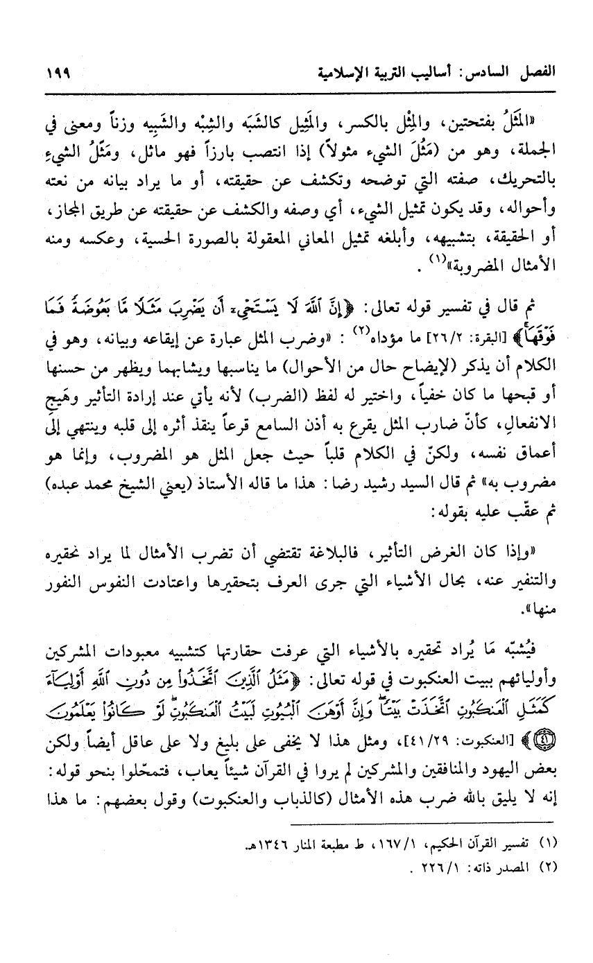 ثم قال في تفسير قوله تعالى: {إِنَّ اللَّهَ لا يَسْتَحْيِي أَنْ يَضْرِبَ مَثَلًا مَا بَعُوضَةً فَمَا فَوْقَهَا} [البقرة: 2/ 26] ما مؤداه3: "وضرب المثل عبارة عن إيقاعه وبيانه، وهو في الكلام أن يذكر "لإيضاح حال من الأحوال" ما يناسبها، ويشابهما ويظهر من حسنها أو قبحها ما كان خفيا، واختبر له لفظ "الضرب"؛ لأنه يأتي عند إرادة التأثير وهيج الانفعال، كأن ضارب المثل يقرع به أذن السامع قرعا ينقذ أثره إلى قلبه، وينتهي إلى أعماق نفسه، ولكن في الكلام قلبا حيث جعل المثل هو المضروب، وإنما هو مضروب به"، ثم قال السيد رشيد رضا: هذا ما قاله الأستاذ "يعني الشيخ محمد عبده"، ثم عقب عليه بقوله: