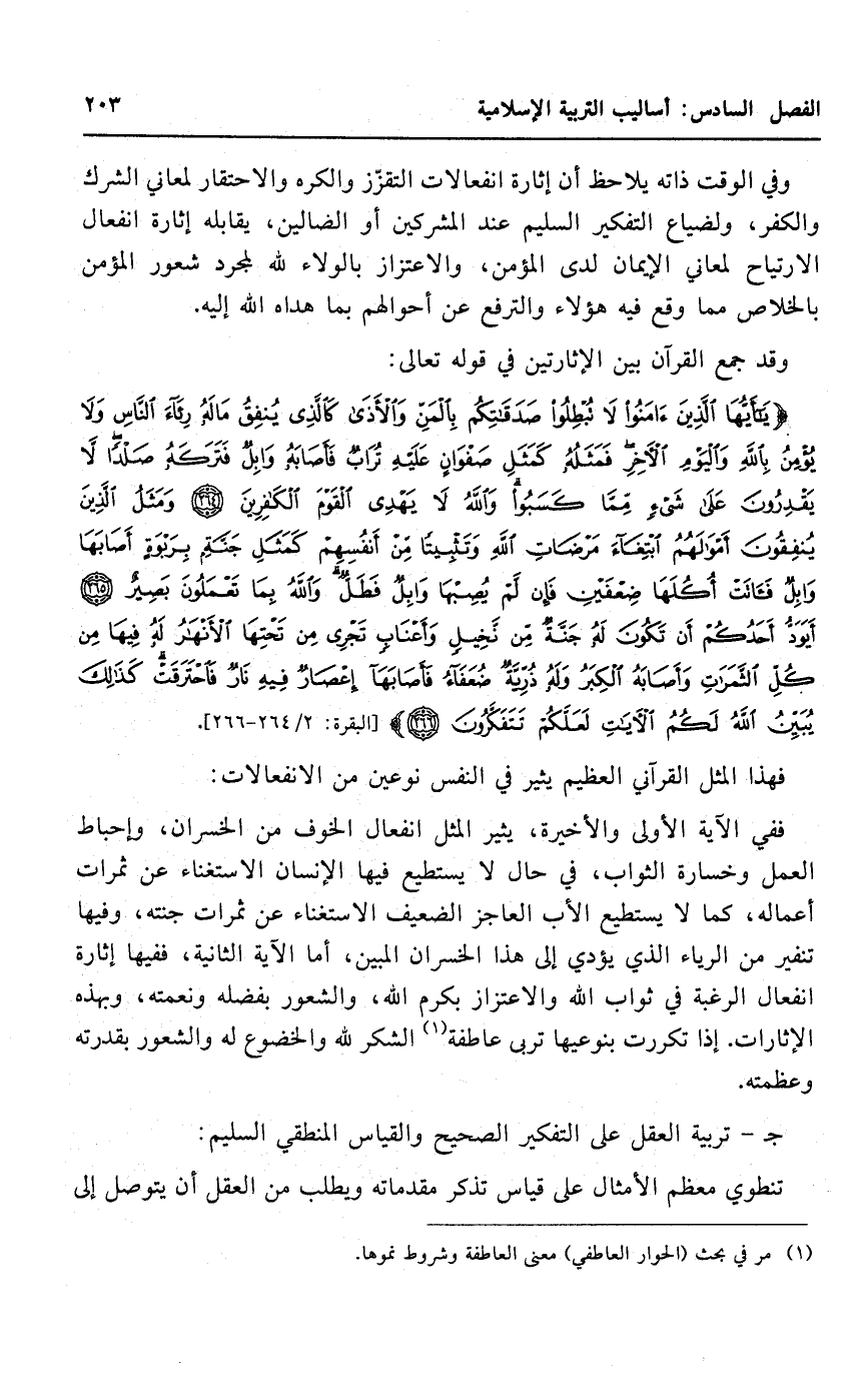 ففي الآية الأولى والأخيرة، يثير المثل انفعال الخوف من الخسران، وإحباط العمل وخسارة الثواب، في حال لا يستطيع فيها الإنسان الاستغناء عن ثمرات أعماله، كما لا يستطيع الأب العاجز الضعيف الاستغناء عن ثمرات جنته، وفيها تنفير من الرياء الذي يؤدي إلى هذا الخسران المبين، أما الآية الثانية، ففيها إثارة انفعال الرغبة في ثواب الله، والاعتزاز بكرم الله، والشعور بفضله ونعمته، وبهذه الإثارات، إذا تكررت بنوعيها تربي عاطفة1 الشكر لله، والخضوع له، والشعور بقدرته وعظمته.