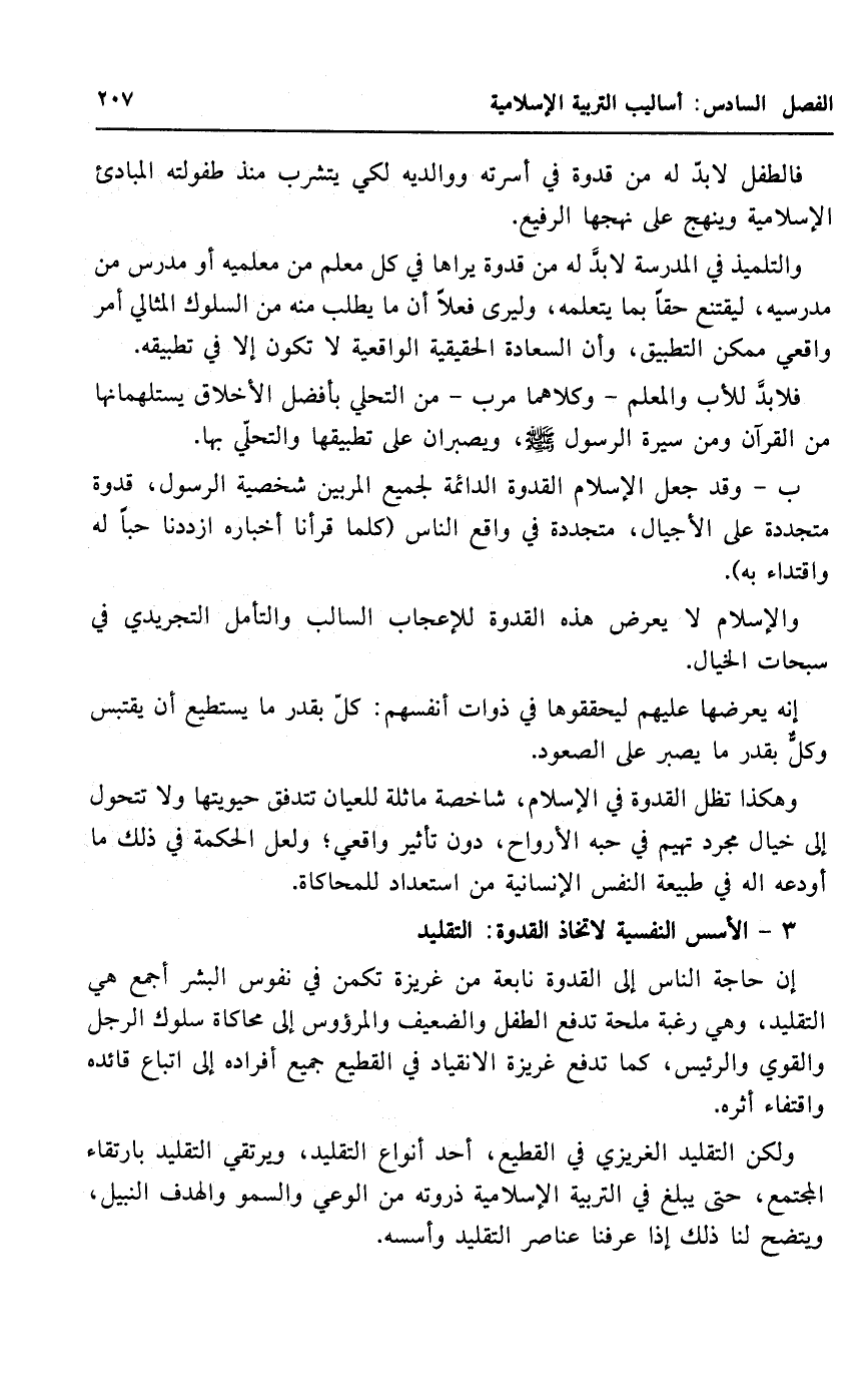 ب- وقد جعل الإسلام القدوة الدائمة لجميع المربين شخصية الرسول، قدوة متجددة على الأجيال، متجددة في واقع الناس "كلما قرآنا أخباره ازددنا حبا له واقتداء به".