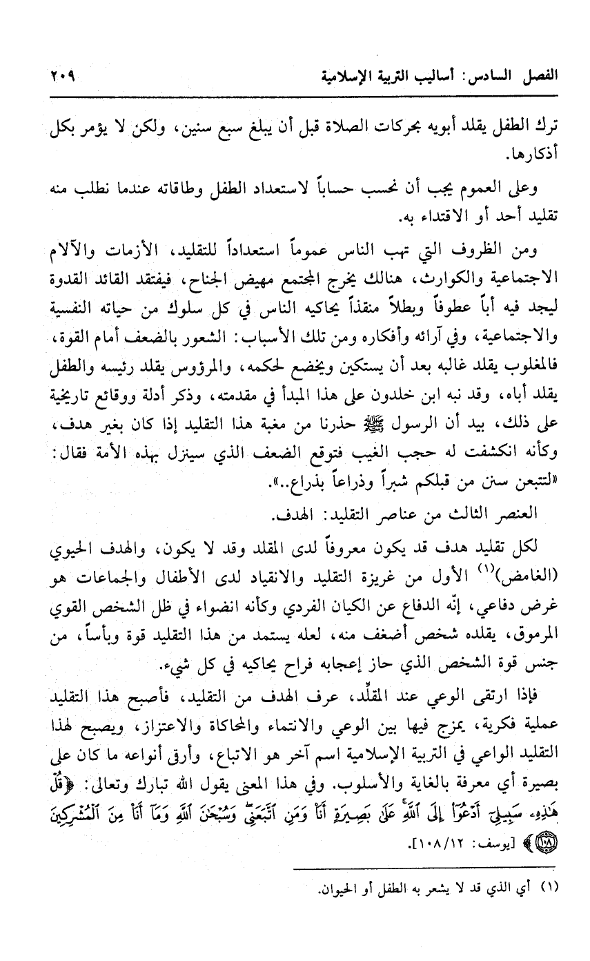فإذا ارتقى الوعي عند المقلد، عرف الهدف من التقليد، فأصبح هذا التقليد عملية فكرية، يمزج فيها بين الوعي والانتماء، والمحاكاة والاعتزاز، ويصبح لهذا بصيرة أي معرفة بالغاية والأسلوب، وفي هذا المعنى يقول اله تبارك وتعالى: {قُلْ هَذِهِ سَبِيلِي أَدْعُو إِلَى اللَّهِ عَلَى بَصِيرَةٍ أَنَا وَمَنِ اتَّبَعَنِي وَسُبْحَانَ اللَّهِ وَمَا أَنَا مِنَ الْمُشْرِكِينَ} [يوسف: 12/ 108] .