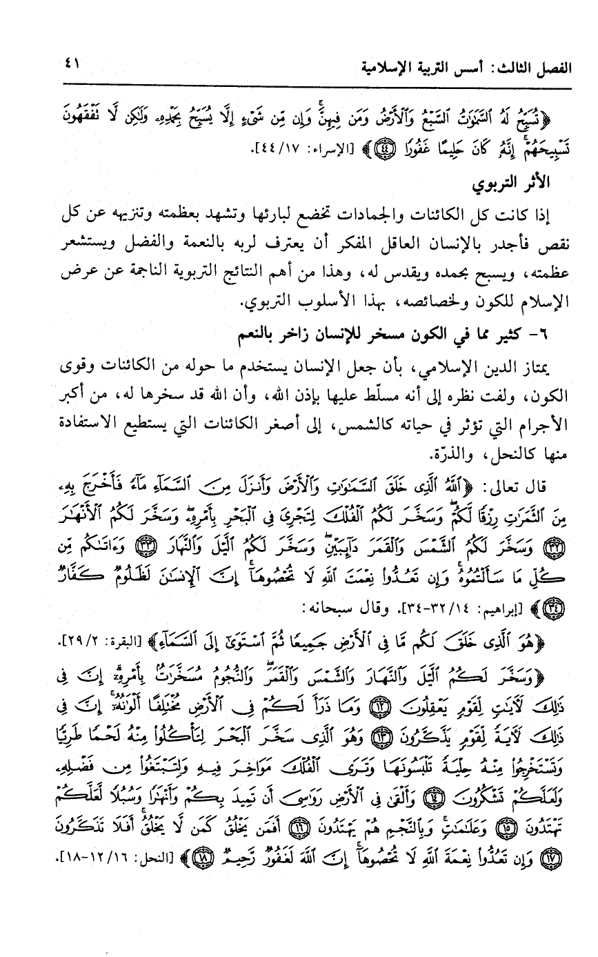 {وَسَخَّرَ لَكُمُ اللَّيْلَ وَالنَّهَارَ وَالشَّمْسَ وَالْقَمَرَ وَالنُّجُومُ مُسَخَّرَاتٌ بِأَمْرِهِ إِنَّ فِي ذَلِكَ لَآياتٍ لِقَوْمٍ يَعْقِلُونَ، وَمَا ذَرَأَ لَكُمْ فِي الْأَرْضِ مُخْتَلِفًا أَلْوَانُهُ إِنَّ فِي ذَلِكَ لَآيَةً لِقَوْمٍ يَذَّكَّرُونَ، وَهُوَ الَّذِي سَخَّرَ الْبَحْرَ لِتَأْكُلُوا مِنْهُ لَحْمًا طَرِيًّا وَتَسْتَخْرِجُوا مِنْهُ حِلْيَةً تَلْبَسُونَهَا وَتَرَى الْفُلْكَ مَوَاخِرَ فِيهِ وَلِتَبْتَغُوا مِنْ فَضْلِهِ وَلَعَلَّكُمْ تَشْكُرُونَ، وَأَلْقَى فِي الْأَرْضِ رَوَاسِيَ أَنْ تَمِيدَ بِكُمْ وَأَنْهَارًا وَسُبُلًا لَعَلَّكُمْ تَهْتَدُونَ، وَعَلامَاتٍ وَبِالنَّجْمِ هُمْ يَهْتَدُونَ، أَفَمَنْ يَخْلُقُ كَمَنْ لا يَخْلُقُ أَفَلا تَذَكَّرُونَ، وَإِنْ تَعُدُّوا نِعْمَةَ اللَّهِ لا تُحْصُوهَا إِنَّ اللَّهَ لَغَفُورٌ رَحِيمٌ} [النحل: 16/ 12-18] .