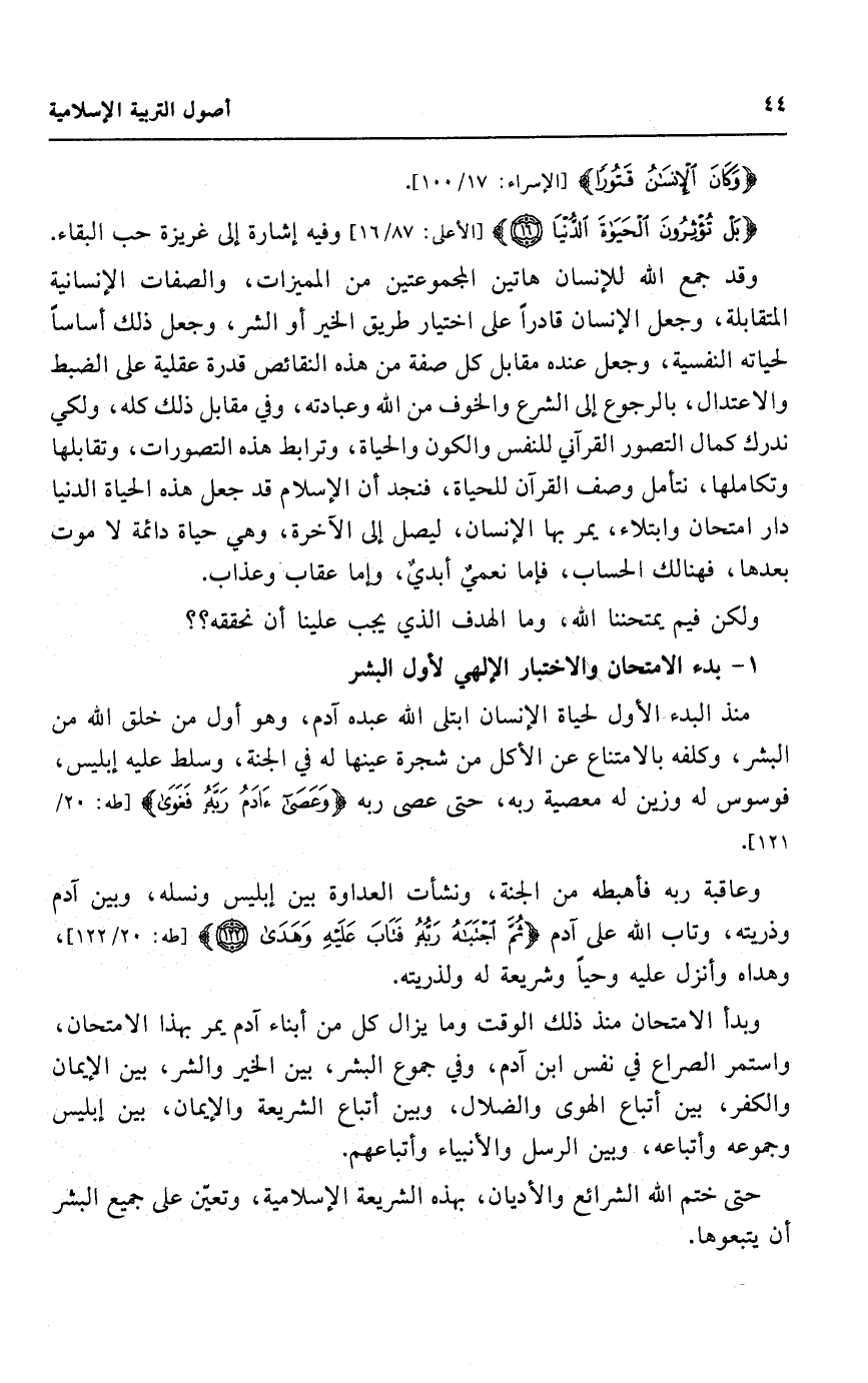 وقد جمع الله للإنسان هاتين المجموعتين من المميزات، والصفات الإنسانية المتقابلة، وجعل الإنسان قادرًا على اختيار طريق الخير أو الشر، وجعل ذلك أساسا لحياته النفسية، وجعل عنده مقابل كل صفة من هذه النقائض قدرة عقلية على الضبط والاعتدال، وبالرجوع إلى الشرع والخوف من الله وعبادته، وفي مقابل ذلك كله، ولكي ندرك كمال التصور القرآني للنفس، والكون والحياة، وترابط هذه التصورات، وتقابلها وتكاملها، نتأمل وصف القرآن للحياة، فنجد أن الإسلام قد جعل هذه الحياة الدنيا دار امتحان وابتلاء، يمر بها الإنسان، ليصل إلى الآخرة، وهي حياة دائمة لام موت بعدها، فهنالك الحساب، فإما نعمي أبدي، وإما عقاب وعذاب.