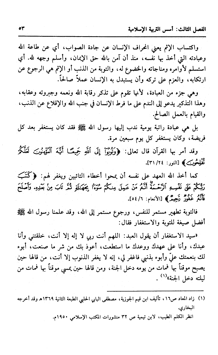 فالتوبة تطهير مستمر للنفس، ورجوع مستمر إلى الله، وقد علمنا رسول الله صلى الله عليه وسلم أفضل صيغة للتوبة، والاستغفار فقال: