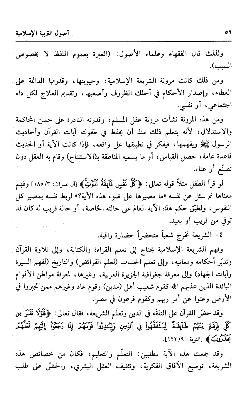 وقد حض القرآن على التفقه في الدين وتعلم الشريعة، فقال تعالى: {فَلَوْلا نَفَرَ مِنْ كُلِّ فِرْقَةٍ مِنْهُمْ طَائِفَةٌ لِيَتَفَقَّهُوا فِي الدِّينِ وَلِيُنْذِرُوا قَوْمَهُمْ إِذَا رَجَعُوا إِلَيْهِمْ لَعَلَّهُمْ يَحْذَرُونَ} [التوبة: 9/ 122] .