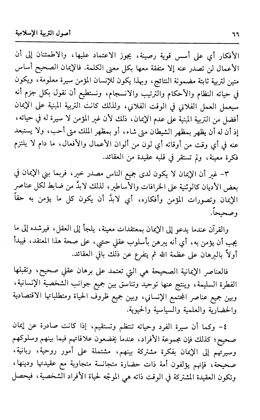 4- وكما أن سيرة الفرد وحياته تنتظم وتستقيم، إذا كانت صادرة عن إيمان صحيح، كذلك فإن مجموعة الأفراد، عندما يخضعون علاقاتهم فيما بينهم وسلوكهم، وسيرتهم إلى الإيمان بفكرة مشتركة بينهم، مشتملة على أمور روحية، ربانية، صحيحة، فإنهم يؤلفون أمة ذات حضارة متجانسة متجاوبة مع عقيدتها ودينها، وتكون العقيدة المشتركة في الوقت ذاته في الموجه لحياة الأفراد الشخصية، فيحصل تناسق بين حضارة الأمة ونظمها الاجتماعية، وبين سيرة أفرادها وفي هذا كمال الحياة النفسية الصحيحة، والتجاوب الاجتماعي السليم، فيصبح المجتمع المؤمن كالبنان يشد بعضه بعضا، ويصبح المؤمنون كالجسد إذا اشتكى منه عضو تداعى له سائر الجسد بالسهر والحمى، وهكذا تكون التربية