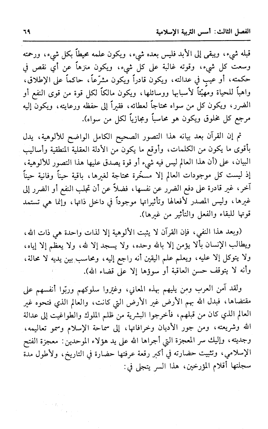 قبله شيء، ويبقى إلى الأبد فليس بعده شيء، ويكون علمه محيطا بكل شيء، ورحمته وسعت كل شيء، وقوته غالبة على كل شيء، ويكون منزها عن أي نقص في حكمته، أو عيب في عدالته، ويكون قادرا ويكون مشرعا، حاكما على الإطلاق، واهبا للحياة ومهيئا لأسبابها ووسائلها، ويكون مالكا لكل قوة من قوى النفع أو الضرر، ويكون كل من سواه محتاجا لعطائه، فقيرا إلى حفظه ورعايته، ويكون إليه مرجع كل مخلوق، ويكون هو محاسبا ومجازيا لكل من سواه".
