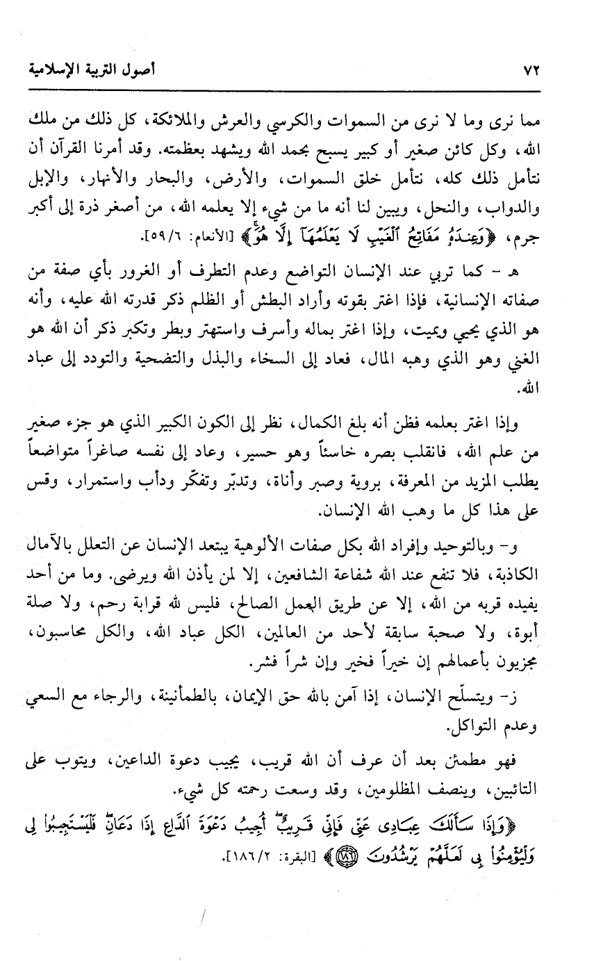 ز- ويتسلح الإنسان، إذا آمن بالله حق الإيمان، بالطمأنينة، والرجاء مع السعي وعد التواكل.