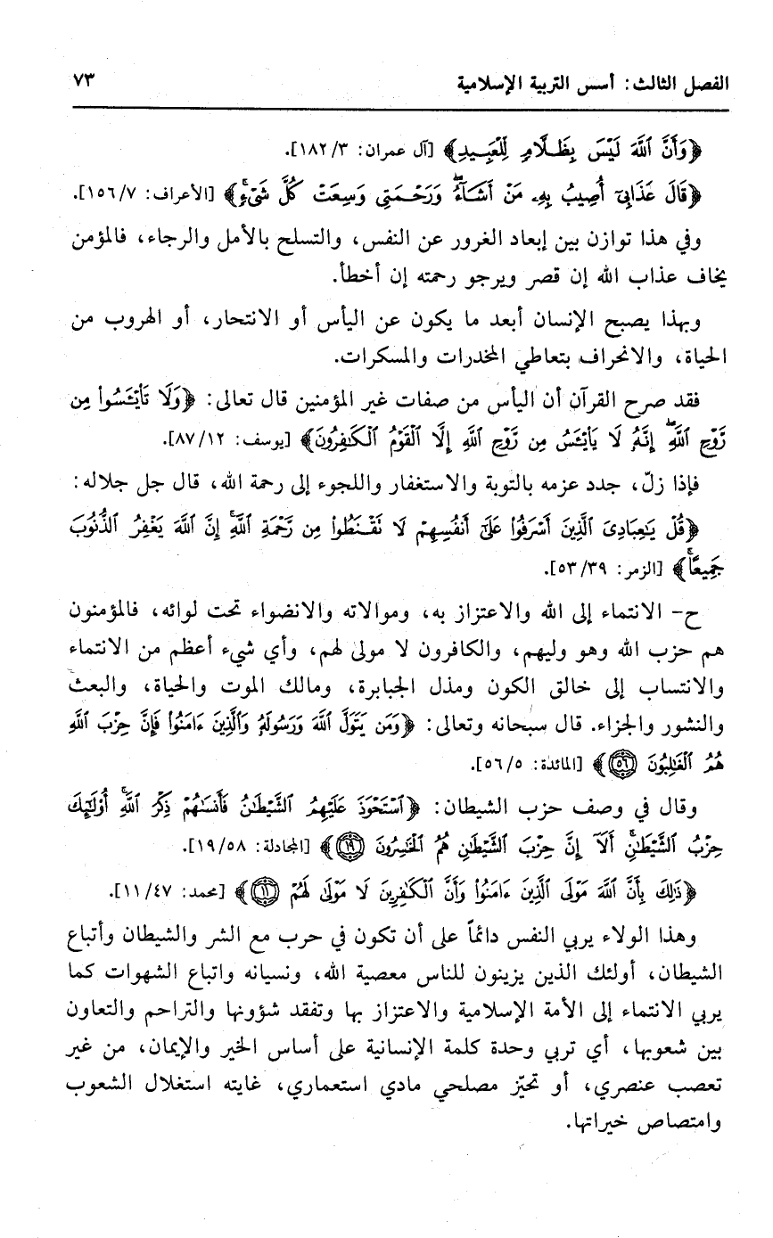 وهذا الولاء يربى النفس دائما على أن تكون في حرب مع الشر والشيطان، وأتباع الشيطان، أولئك الذين يزينون للناس معصية الله، ونسيانه واتباع الشهوات كما يربي الانتماء إلى الأمة الإسلامية والاعتزاز بها، وتفقد شئونها والتراحم، والتعاون بين شعوبها، أي تربي وحده كلمة الإنسانية على أساس الخير والانتماء، من غير تعصب عنصري، أو تحيز مصلحي مادي استعماري، غايته استغلال الشعوب، وامتصاص خيراتها.