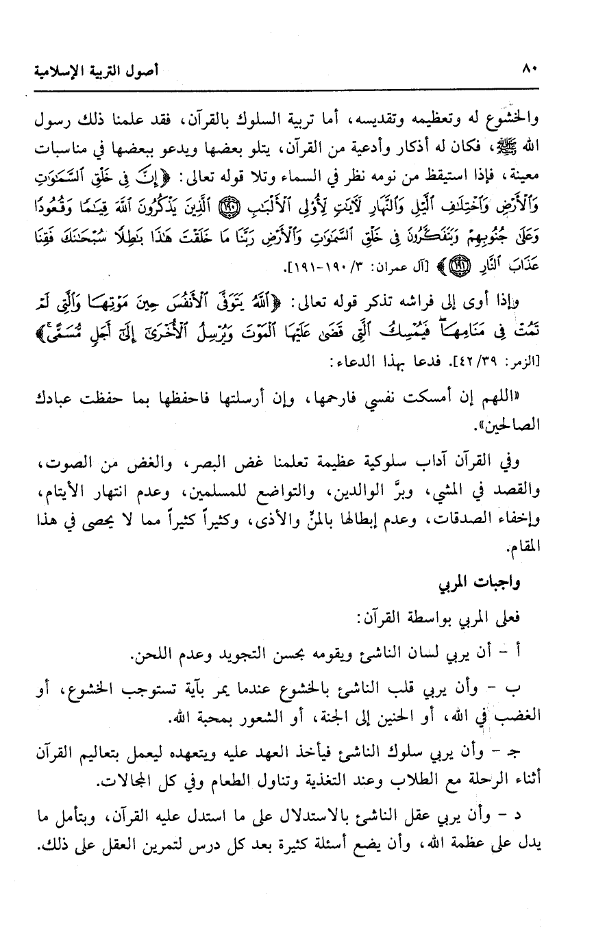 والخشوع له وتعظيمه وتقديسه، أما تربية السلوك بالقرآن، فقد علمنا ذلك رسول الله صلى الله عليه وسلم، فكان له أذكار وأدعيه من القرآن، يتلو بعضها ويدعو ببعضها في مناسبات معينة، فإذا استيقظ من نومه نظر في السماء، وتلا قوله تعالى: {إِنَّ فِي خَلْقِ السَّمَوَاتِ وَالْأَرْضِ وَاخْتِلافِ اللَّيْلِ وَالنَّهَارِ لَآياتٍ لِأُولِي الْأَلْبَابِ، الَّذِينَ يَذْكُرُونَ اللَّهَ قِيَامًا وَقُعُودًا وَعَلَى جُنُوبِهِمْ وَيَتَفَكَّرُونَ فِي خَلْقِ السَّمَوَاتِ وَالْأَرْضِ رَبَّنَا مَا خَلَقْتَ هَذَا بَاطِلًا سُبْحَانَكَ فَقِنَا عَذَابَ النَّار} [آل عمران: 3/ 190-191] .