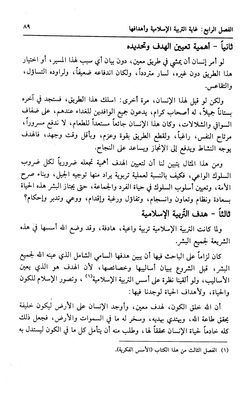 ومن هذا المثال يتبين لنا أن لتعيين الهدف أهمية تجلعه ضروريا لكل ضروب السلوك الواعي، فكيف بالنسبة لعملية تربوية يراد منها توجيه الجيل، وبناء صرح الأمة، وتعيين أسلوب السلوك في حياة الفرد والجماعة، حتى يجتاز البشر هذه الحياة بسعادة، ونظام وتعاون، وانسجام، وتفاؤل ورغبة وإقدام، ووعي وتدبر وإحكام؟