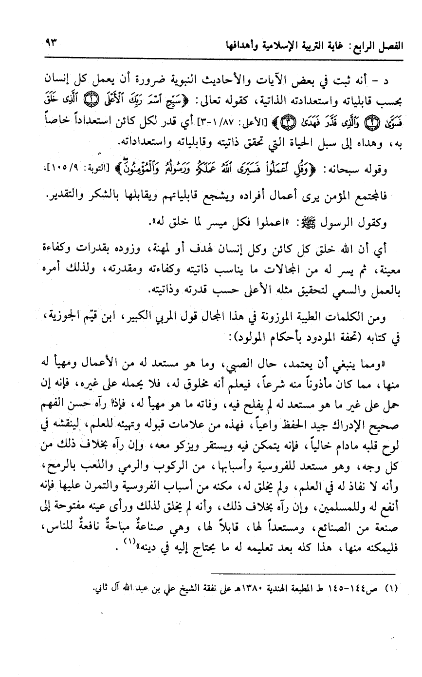 د- أنه ثبت في بعض الآيات، والأحاديث النبوية ضرورة أن يعمل كل إنسان بحسب قابلياته، واستعدادته الذاتية، كقوله تعالى: {سَبِّحِ اسْمَ رَبِّكَ الْأَعْلَى، الَّذِي خَلَقَ فَسَوَّى، وَالَّذِي قَدَّرَ فَهَدَى} [الأعلى: 87/ 1-3] أي قدر لكل كائن استعدادا خاصا به، وهداه إلى سبيل الحياة التي تحقق ذاتيته، وقابلياته واستعدادته.