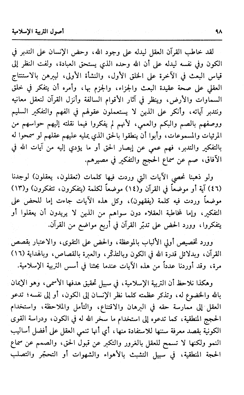 وهكذا نلاحظ أن التربية الإسلامية، في سبيل تحقيق هدفها الأسمى، وهو الإيمان بالله والخضوع له، وتذكر عظمته كلما نظر الإنسان إلى الكون، أو إلى نفسه؛ تدعو العقل إلى ممارسة حقه في البرهان والاقتناع، والتأمل والملاحظة، واستخدام الحجج المنطقية، كما تدعوه إلى استخدام ما سخر الله له في الكون، ودراسة القوى الكونية بقصد معرفة سننها للاستفادة منها، أي أنها تنمي العقل على أفضل أساليب النمو، ولكنها لا تسمح للعقل بالغرور، والتكبر عن قبول الحق، والصمم عن سماع الحجة المنطقية، في سبيل التشبث بالأهواء والشهوات، أو التحجر والتصلب