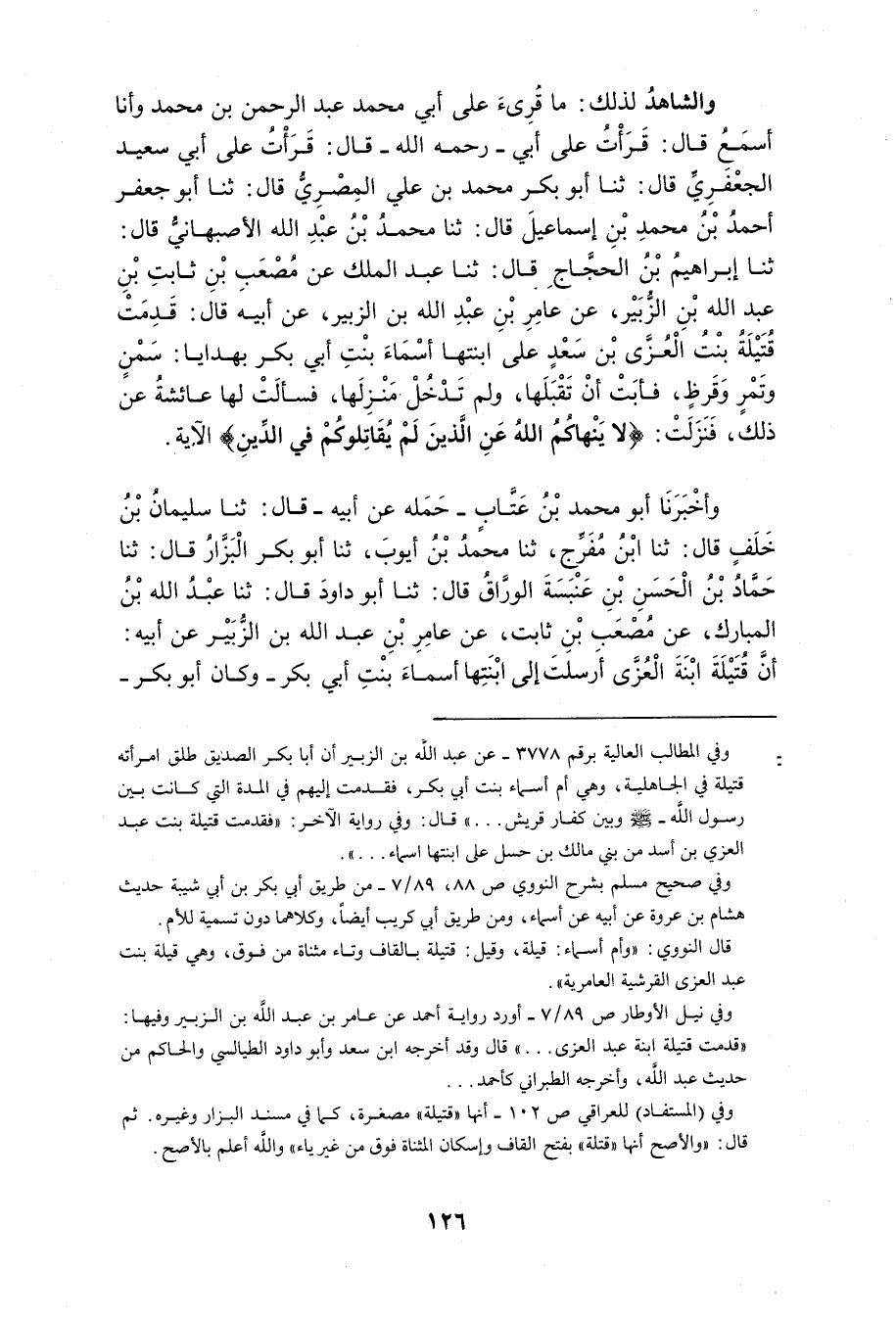 قَرَأْتُ عَلَى أَبِي بَكْرٍ مُحَمَّدُ بْنُ عَبْدِ اللَّهِ الْمَعَافِرِيُّ أَخْبَرَكَ أَبُو الْحَسَنِ عَلِيُّ بْنُ أَيُّوبَ الْبَزَّارُ فَأَقَرَّ بِهِ قَالَ ثَنَا عَبْدُ الْغَفَّارِ بْنُ مُحَمَّدٍ قَالَ ثَنَا أَبُو عَلِيٍّ مُحَمَّدُ بْنُ أَحْمَدَ بْنِ الْحَسَنِ قَالَ ثَنَا هِشَامُ بْنُ عُرْوَةَ أَنَّهُ سَمِعَ أَبَاهُ يَقُولُ أَخْبَرَتْنِي أَسْمَاءُ بِنْتُ أَبِي بَكْرٍ الصِّدِّيقِ قَالَتْ أَتَتْنِي أُمِّي رَاغِبَةً فِي عَهْدِ قُرَيْشٍ فَسَأَلْتُ رَسُولَ اللَّهِ صَلَّى اللَّهُ عَلَيْهِ وَسَلَّمَ صِلَتَهَا قَالَ نَعَمْ قَالَ سُفْيَانُ وَفِيهَا نَزَلَتْ {لَا يَنْهَاكُمُ اللَّهُ عَنِ الَّذِينَ لم يُقَاتِلُوكُمْ فِي الدَّين} فِي الْآيَة 8 الممتحنة