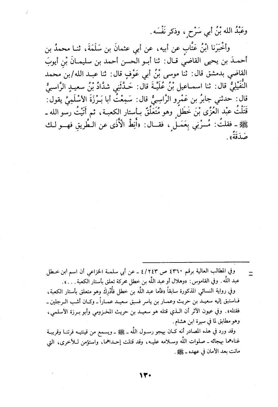 قَالَ الدَّارَقُطْنِيُّ أَنا إِسْمَاعِيلُ بْنُ مُحَمَّدٍ الصَّفَّارُ ثَنَا عَبَّاسُ بْنُ مُحَمَّدٍ قَالَ ثَنَا الْحَسَنُ بْنُ بِشْرٍ قَالَ ثَنَا الْحَكَمُ بْنُ عَبْدِ الْمَلِكِ عَنْ قَتَادَةَ عَن أنس عَن مَالِكٍ قَالَ أَمَّنَ رَسُولُ اللَّهِ صَلَّى اللَّهُ عَلَيْهِ وَسَلَّمَ النَّاسَ يَوْمَ فَتْحِ مَكَّةَ إِلا أَرْبَعَةَ نَفَرٍ عَبْدَ الْعُزَّى بْنَ خَطَلٍ وَمِقْيَسُ بْنُ صُبَابَةَ وَعَبْدُ اللَّهِ بن سعد ابْن أَبِي سَرْحٍ وَأُمَّ سَارَّةَ وَأُمَّ عَبْدِ الْعُزَّى فَقُتِلَ وَهُوَ آخِذٌ بِأَسْتَارِ الْكَعْبَةِ