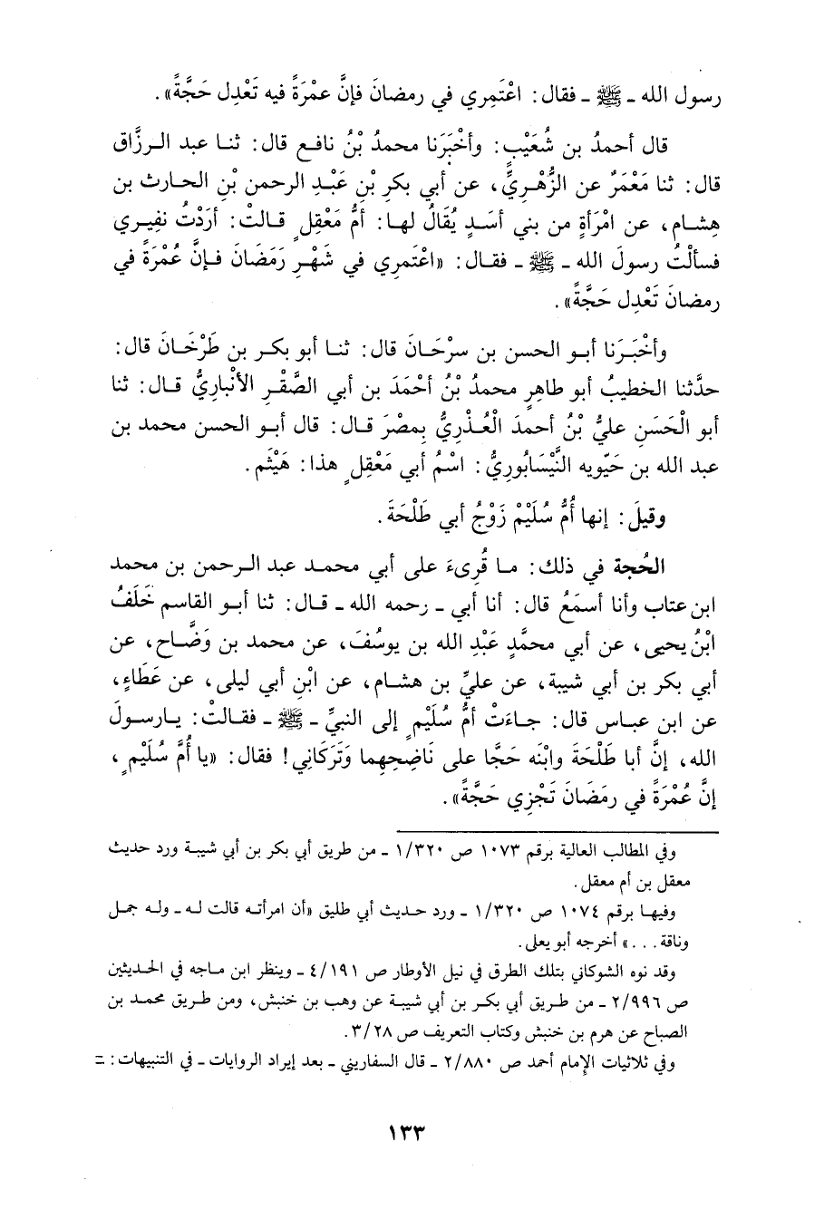 وَالْحجّة فِي ذَلِك مَا أَخْبَرَنَا بِهِ أَبُو بَحْرٍ الأَسَدِيُّ قِرَاءَةً عَلَيْهِ وَأَنَا أَسْمَعُ عَنْ أَبِي الْعَبَّاسِ أَحْمَدَ بْنِ عُمَرَ العذري ثَنَا الْحَسَنِ الرَّازِيُّ ثَنَا أَبُو أَحْمَدَ مُحَمَّدُ بْنُ عِيسَى ثَنَا إِبْرَاهِيمُ بْنُ سُفْيَانَ عَنْ مُسْلِمٍ قَالَ ثَنَا أَحْمَدُ بْنُ عَبْدَةَ الضَّبِّيُّ قَالَ ثَنَا يَزِيدُ يَعْنِي ابْنَ زُرَيْعٍ قَالَ ثَنَا حَبِيبٌ الْمُعَلِّمُ عَنْ عَطَاءٍ عَنِ ابْنِ عَبَّاسٍ أَن الرَّسُولُ صَلَّى اللَّهُ عَلَيْهِ وَسَلَّمَ قَالَ لامْرَأَةٍ مِنَ الأَنْصَارِ يُقَالُ لَهَا أُمُّ سِنَانٍ مَا مَنَعَكِ أَنْ تَكُونِي حَجَجْتِ مَعَنَا قَالَتْ نَاضِحَانِ كَانَا لأَبِي فُلانٍ زَوْجِهَا حَجَّ هُوَ وَابْنُهُ عَلَى أَحَدِهِمَا وَكَانَ الآخَرُ يَسْقِي عَلَيْهِ غُلامُنَا فَقَالَ {عُمْرَةٌ فِي رَمَضَانَ تَقْضِي حَجَّةً أَوْ حَجَّةً مَعِي} وَقِيلَ إِنَّهَا أُمُّ مَعْقِلٍ الأَسْدِيَّةِ زَوْجِ أَبِي مَعْقِلٍ وَاسْمُهُ هَيْثَمٌ