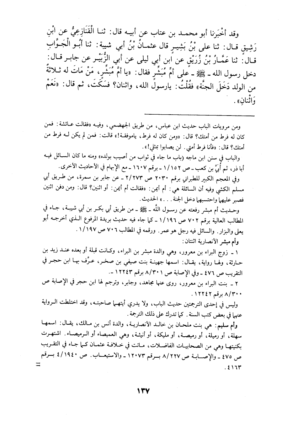 قَرَأَ عَلَيْنَا أَبُو بَكْرٍ مُحَمَّدُ بْنِ عَبْدِ اللَّهِ بْنِ مُحَمَّدٍ الْحَافِظُ بِلَفْظِهِ قَالَ قَرَأَ عَلَيْنَا أَبُو الْفَتْحِ نَصْرُ بْنُ إِبْرَاهِيمَ بِلَفْظِهِ قَالَ ثَنَا أَبُو بَكْرٍ مُحَمَّدُ بْنُ جَعْفَرِ بْنِ عَلِيٍّ قَالَ ثَنَا أَبُو بَكْرٍ مُحَمَّدُ بْنُ الْعَبَّاسِ الْعُزِّيُّ قَالَ ثَنَا أَبُو عَليّ الْحسن ابْن الْفَرَجِ حَدَّثَنَا يَحْيَى بْنُ بُكَيْرٍ عَنْ مَالِكِ بْنِ أَنَسٍ عَنْ مُحَمَّد بن أبي بكر ابْن مُحَمَّدٍ عَنْ أَبِيهِ عَنْ أَبِي النَّضْرِ السُّلَمِيِّ أَنَّ رَسُولَ اللَّهِ صَلَّى اللَّهُ عَلَيْهِ وَسَلَّمَ قَالَ لايموت لأَحَدٍ مِنَ الْمُسْلِمِينَ ثَلاثَةٌ مِنَ الْوَلَدِ فَيَحْتَسِبُهُمْ إِلا كَانُوا لَهُ جُنَّةً مِنَ النَّارِ فَقَالَتِ امْرَأَةٌ عِنْدَهُ أَوِ اثْنَانِ يَا رَسُولَ اللَّهِ قَالَ أَوِ اثْنَانِ