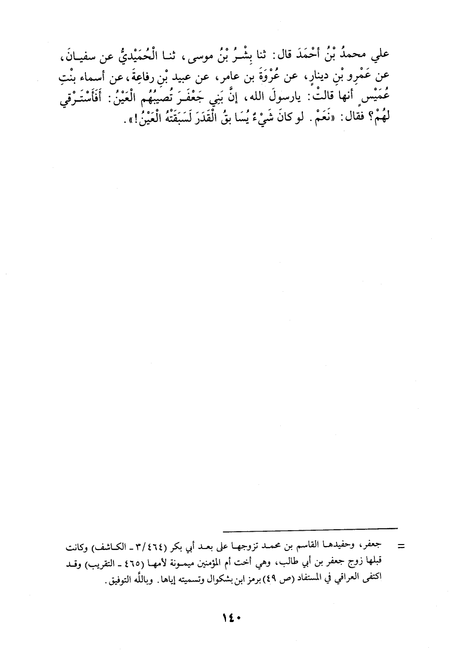 قَرَأْتُ عَلَى أَبِي مُحَمَّدٍ عَبْدُ الرَّحْمَنِ بْنُ مُحَمَّدِ عَنْ أَبِيهِ رَحِمَهُ اللَّهُ قَالَ ثَنَا عَبْدُ الرَّحْمَنِ بْنُ أَحْمَدَ وَخَلَفُ بْنُ يَحْيَى قَالا ثَنَا أَحْمَدُ بْنُ مُطَرِّفٍ عَنْ عَبْدِ الله ابْن يَحْيَى عَنْ يَحْيَى عَنْ مَالِكٍ عَنْ حُمَيْدِ بْنِ قَيْسٍ الْمَكِّيِّ أَنَّهُ قَالَ دُخِلَ عَلَى رَسُولِ اللَّهِ صَلَّى اللَّهُ عَلَيْهِ وَسَلَّمَ بِابْنَيْ جَعْفَرِ بْنِ أَبِي طَالِبٍ فَقَالَ لِحَاضِنَتِهِمَا مَا لِي أَرَاهُمَا ضَارِعَيْنِ فَقَالَتْ حَاضِنَتُهُمَا يَا رَسُولَ اللَّهِ إِنَّهُ تُسْرِعُ إِلَيْهِمَا الْعَيْنُ وَلَمْ يَمْنَعْنَا أَنْ نَسْتَرْقِيَ لَهُمَا إِلا أَنَّا لَا نَدْرِي مَا يُوَافِقُكَ مِنْ ذَلِكَ فَقَالَ رَسُولُ اللَّهِ صَلَّى اللَّهُ عَلَيْهِ وَسَلَّمَ اسْتَرْقُوا لَهُمَا فَإِنَّهُ لَوْ سَبَقَ شَيْءٌ الْقَدَرَ لَسَبَقَتْهُ الْعَيْنُ الْحَاضِنَةُ الْمَذْكُورَةُ هِيَ أَسْمَاءُ بِنْتُ عُمَيْسٍ