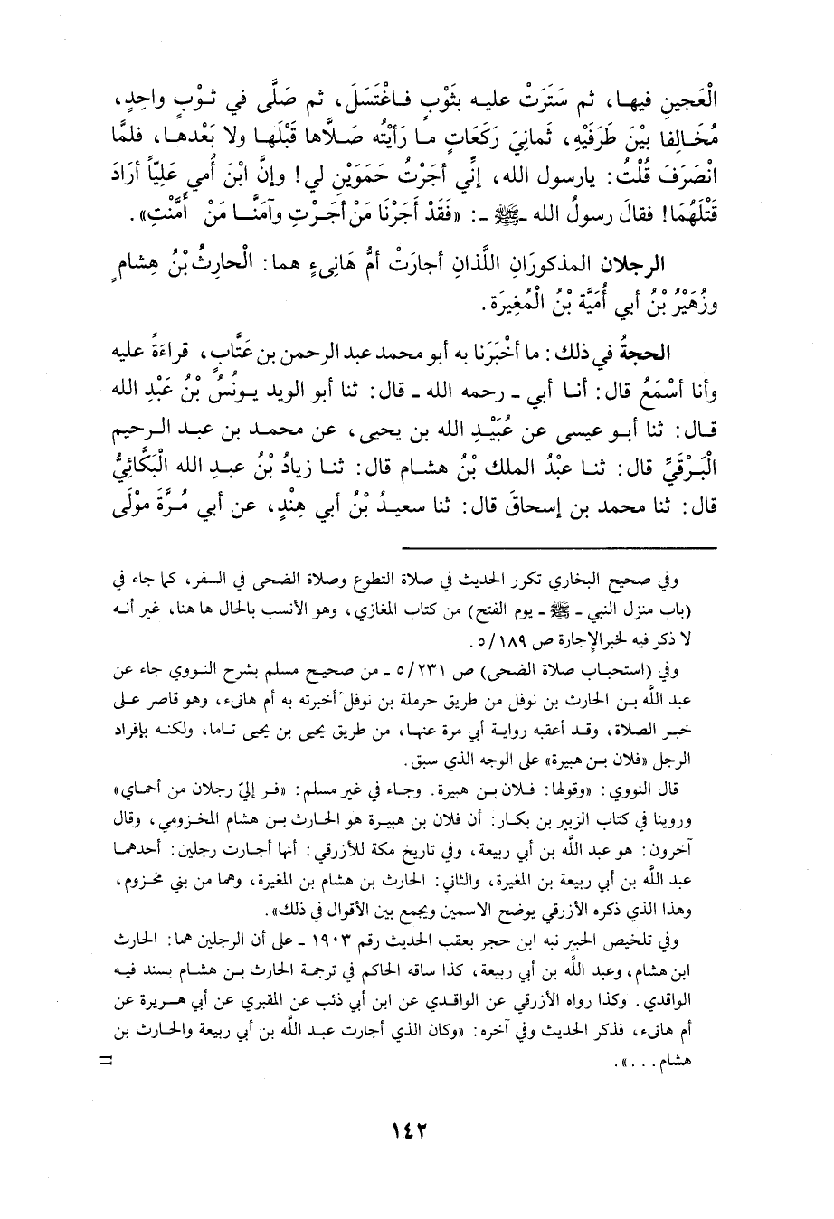 قَرَأْتُ عَلَى أَبِي بَكْرٍ مُحَمَّدِ بْنِ عَبْدِ اللَّهِ الْمَعَافِرِيِّ قَالَ أَنْبَأَ أَبُو الْحسن عَليّ ابْن أَيُّوبَ قَالَ ثَنَا أَبُو طَاهِرٍ عَبْدُ الْغَفَّارِ بْنُ مُحَمَّدٍ قَالَ ثَنَا أَبُو عَليّ مُحَمَّد ابْن أَحْمَدُ بْنُ الْحَسَنِ قَالَ ثَنَا بِشْرُ بْنُ مُوسَى قَالَ ثَنَا عبد الله ابْن الزُّبَيْرِ الْحُمَيْدِيُّ قَالَ ثَنَا سُفْيَانُ ثَنَا مُحَمَّدُ بْنُ عَجْلانَ عَنْ سَعِيدِ بْنِ أَبِي سَعِيدٍ عَنْ أَبِي مُرَّةَ مَوْلَى عَقِيلٍ عَنْ أم هانىء قَالَتْ أَتَانِي يَوْمَ الْفَتْحِ حَمْوَانِ لِي فَأَجَرْتُهُمَا فَجَاءَ عَلِيٌّ يُرِيدُ قَتْلَهُمَا فَأَتَيْتُ رَسُولَ اللَّهِ صَلَّى اللَّهُ عَلَيْهِ وَسَلَّمَ وَهُوَ فِي قُبَّتِهِ بِالأَبْطَحِ بِأَعْلَى مَكَّةَ فَلَمْ أَجِدْهُ وَوَجَدْتُ فَاطِمَةَ فَهِيَ كَانَتْ عَليّ أَشد من عَليّ فَقَالَ تُؤْوِينَ الْكُفَّارَ وَتُجِيرِينَهُمْ وَتَفْعَلِينَ وَتَفْعَلِينَ فَلَمْ أَلْبَثْ أَنْ جَاءَ رَسُولُ اللَّهِ صَلَّى اللَّهُ عَلَيْهِ وَسَلَّمَ وعَلى وَجهه وهجة الْعُفَارِ فَقَالَ يَا فَاطِمَةُ اسْكُبِي لِي غُسْلا فَسَكَبَتْ لَهُ غُسْلا فِي جَفْنَةٍ فَكَأَنِّي أَنْظُرُ إِلَى أثر