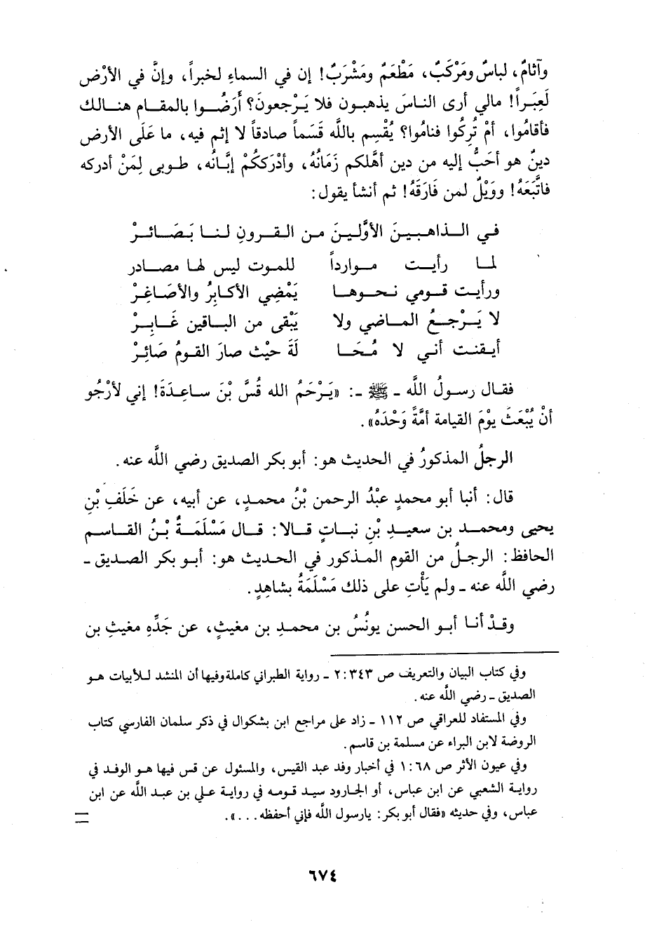 (حَدَّثَنَا قُسُّ بْنُ سَاعِدَةَ) أنبا أَبُو مُحَمَّدٍ عَبْدُ الرَّحْمَنِ بْنِ مُحَمَّدٍ عَنْ أَبِيهِ قَالَ أَنْبَا أَبُو الْقَاسِمِ خَلَفُ بْنُ يَحْيَى قَالَ أَنْبَأَ عَبْدُ الرَّحْمَنِ بْنَ عِيسَى وَمَسْلَمَةُ بْنُ الْقَاسِمِ (وَاللَّفْظُ لَهُ) قَالا ثَنَا أَبُو عُمَرَ أَحْمَدُ بْنُ خَالِدِ بْنِ يَزِيدَ قَالَ أنبا أَبُو مُحَمَّدٍ عُبَيْدُ بْنُ مُحَمَّدٍ الْكَشْوَرِيُّ إِمْلاءً عَلَيْنَا مِنْ كِتَابَهِ قَالَ ثَنَا سَهْلُ بْنُ عَمْرٍو الْبَصْرِيُّ قَالَ ثَنَا مُحَمَّدُ بْنُ خَالِدٍ الْيَشْكُرِيُّ مِنْ بَنِي يَشْكُرَ هَكَذَا قَالَ ثَنَا أَبُو عَبْدِ اللَّهِ أَحْمَدُ بْنُ الْحَسَنِ الرَّازِيُّ قَالَ أَنا بِشْرُ بْنُ عَبْدِ اللَّهِ الدَّارِمِيُّ قَالَ ثَنَا أَبُو مَسْعُودٍ الْحلَبِي عَنِ الْكَلْبِيِّ عَنْ أَبِي صَالِحٍ عَنِ ابْنِ عَبَّاسٍ قَالَ لَمَّا قَدِمَ عَلَى رَسُولِ اللَّهِ صَلَّى اللَّهُ عَلَيْهِ وَسَلَّمَ وَفْدُ إِيَادٍ قَالَ رَسُولُ اللَّهِ صَلَّى اللَّهُ عَلَيْهِ وَسلم مَا فعل قُسُّ بْنُ سَاعِدَةَ قَالُوا مَاتَ يَا رَسُول اله فَقَالَ رَسُولُ اللَّهِ صَلَّى اللَّهُ عَلَيْهِ وَسَلَّمَ يَرْحَمُ اللَّهُ قُسُّ بن سَاعَة كَأَنِّي أَنْظُرُ إِلَيْهِ بِسُوقِ عُكَاظَ عَلَى جَمَلٍ لَهُ أَوْرَقَ وَهُوَ يَتَكَلَّمُ بِكَلامٍ عَلَيْهِ حَلاوَةٌ وَمَا أَجِدُنِي أَحْفَظُهُ فَقَالَ رَجُلٌ مِنَ الْقَوْمِ أَنَا يَا رَسُولَ اللَّهِ أَحْفَظُهُ سَمِعْتُهُ بِسُوقِ عُكَاظَ وَهُوَ يَقُولُ أَيُّهَا النَّاسُ اسْمَعُوا وَعُوا وَاحْفَظُوا مَنْ عَاشَ مَاتَ وَمَنْ مَاتَ فَاتَ وَكُلُّ مَا هُوَ آتٍ آتٍ لَيْلٌ دَاجٍ وَسَمَاءٌ ذَاتُ أَبْرَاجٍ بِمَا تَزْخَرُ وَنُجُومٌ تُزْهِرُ مَطَرٌ وَنَبَاتٌ آبَاءٌ وَأُمَّهَاتٌ ذَاهِبٌ وَآتٍ ضَوْءٌ وَظَلامٌ بِرٌّ