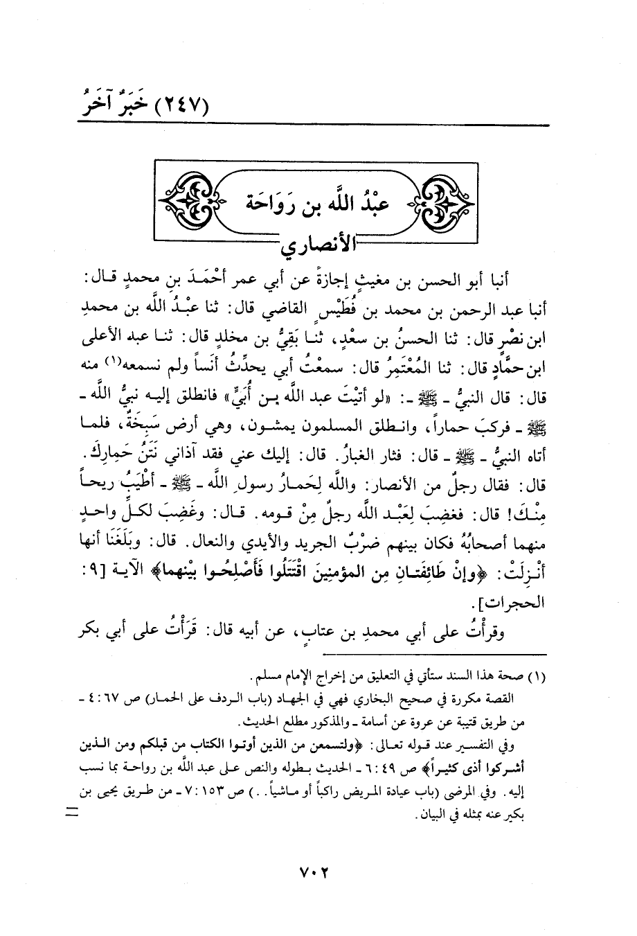 ذَكَرَ ذَلِك الْوَاقِدِيُّ فِي كِتَابِ الرِّدَّةِ لَهُ عَنْ شُيُوخِهِ وَأَخْبَرَنِي بِهِ عَبْدُ الرَّحْمَنِ بْنُ عَبْدِ اللَّهِ عَنْ جَمَاهِرِ بْنِ عَبْدِ الرَّحْمَنِ عَنْ عَبْدِ الرَّحْمَنِ بْنِ الْمُظَفَّرِ عَنْ أَبِي غَالِبٍ عَنْ مُحَمَّدِ بْنِ الْحَسَنِ الأَنْصَارِيِّ عَنْ عَبْدِ اللَّهِ ابْن حَمْزَةَ عَنِ الْوَاقِدِيِّ فِي قِصَّةٍ طَوِيلَة