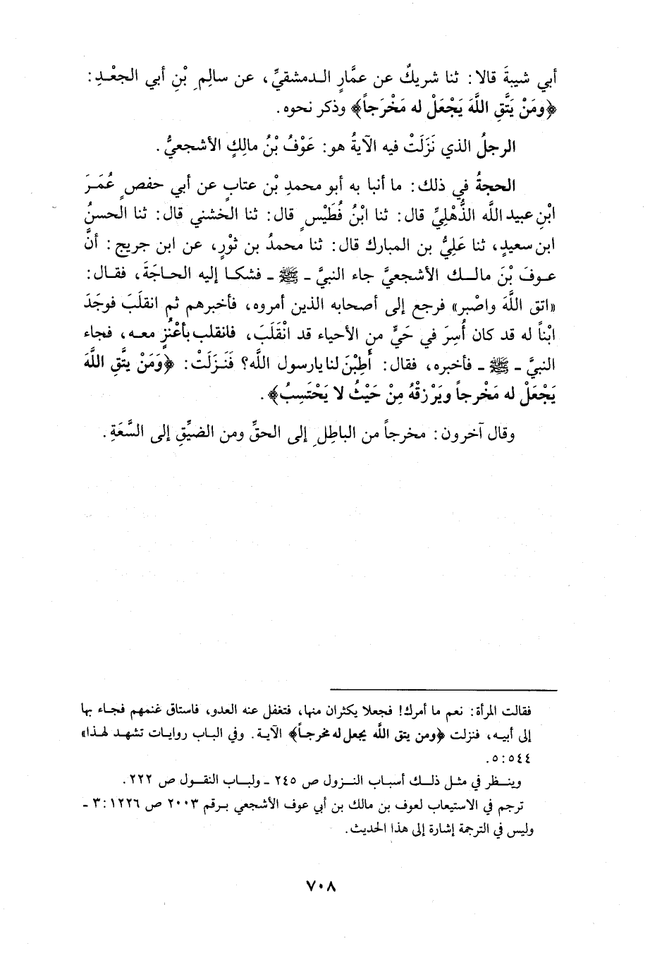 أنبا أَبُو الْحَسَنِ بْنُ مُغِيثٍ عَنْ أَبِي عُمَرَ أَحْمَدَ بْنِ مُحَمَّدِ بْنُ يَحْيَى قَالَ أَنْبَأَ عَبْدُ الرَّحْمَنِ بْنُ مُحَمَّدٍ الْقَاضِي قَالَ ثَنَا الْخُشَنِيُّ قَالَ ثَنَا عُمَرُ عَنْ جَدِّي قَالَ ثَنَا سَلَمَةُ بْنُ شَبِيبٍ قَالَ ثَنَا الْفِرْيَابِيُّ قَالَ ثَنَا عَمَّارُ بْنُ أَبِي مُعَاوِيَةَ عَنْ سَالِمِ بْنِ أَبِي الْجَعْدِ قَالَ نَزَلَتْ هَذِهِ الآيَةُ {وَمَنْ يَتَّقِ اللَّهَ يَجْعَلْ لَهُ مَخْرَجًا وَيَرْزُقْهُ مِنْ حَيْثُ لَا يَحْتَسِبُ} 2 الطَّلَاق فِي رَجُلٍ مِنْ أَشْجَعَ كَانَ فَقِيرًا خَفِيفَ ذَاتِ الْيَدِ كَثِيرَ الْعِيَالِ جَاءَ إِلَى رَسُولِ اللَّهِ صَلَّى اللَّهُ عَلَيْهِ وَسَلَّمَ فَسَأَلَهُ فَقَالَ لَهُ اتَّقِ اللَّهَ وَاصْبِرْ فَرَجَعَ إِلَى أَصْحَابِهِ فَقَالُوا لَهُ أَعْطَاكَ رَسُولُ اللَّهِ صَلَّى اللَّهُ عَلَيْهِ وَسَلَّمَ فَقَالَ مَا أَعْطَانِي شَيْئًا قَالَ لِي اتَّقِ اللَّهَ وَاصْبِرْ فَلَمْ يَلْبَثْ إِلا يَسِيرًا حَتَّى جَاءَ ابْنٌ لَهُ بِغَنَمٍ كَانَ الْعَدُّو أَصَابَهُ فَأَتَى رَسُولَ اللَّهِ صَلَّى اللَّهُ عَلَيْهِ وَسَلَّمَ فَأَخْبَرَهُ خَبَرَهَا فَقَالَ لَهُ رَسُولُ اللَّهِ صَلَّى اللَّهُ عَلَيْهِ وَسَلَّمَ كُلْهَا فَنَزَلَتْ فِيهِ {وَمَنْ يَتَّقِ اللَّهَ يَجْعَلْ لَهُ مَخْرَجًا وَيَرْزُقْهُ مِنْ حَيْثُ لَا يَحْتَسِبُ} 2 3 الطَّلَاق