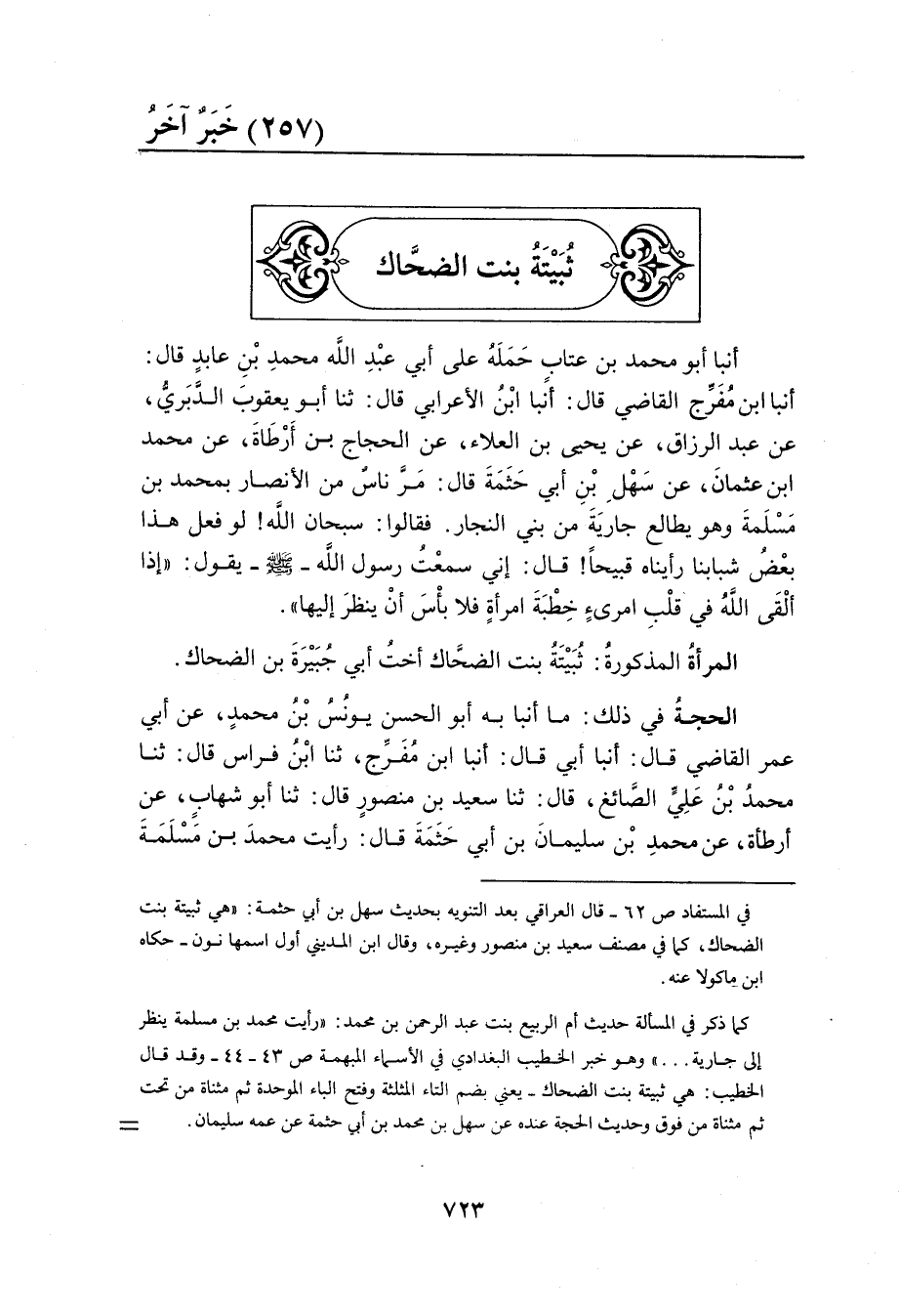 قَانِعٍ قَالَ ثَنَا مُحَمَّدُ بْنُ زَكَرِيَّا الْعَلائِيُّ قَالَ ثَنَا بِشْرُ بْنُ حُجْرٍ الشَّامِيُّ ثَنَا عَلِيُّ بْنُ مَنْصُورٍ الأَنْبَارِيُّ عَنْ عُثْمَانَ بْنِ عَبْدِ الرَّحْمَنِ الْوَقَّاصِيِّ عَنْ مُحَمَّد ابْن كَعْبٍ قَالَ بَيْنَمَا عُمَرُ بْنُ الْخَطَّابِ جَالِسٌ إِذْ مَرَّ بِهِ رَجُلٌ فَسَلَّمَ عَلَيْهِ فَقَالَ رَجُلٌ هَذَا سَوَّادُ بْنُ قَارِبٍ الَّذِي أَتَاهُ رَئِيَّهُ مِنَ الْجِنِّ بِظُهُورِ النَّبِيِّ صَلَّى اللَّهُ عَلَيْهِ وَسَلَّمَ فَدَعَاهُ عمر وَذكر الحَدِيث