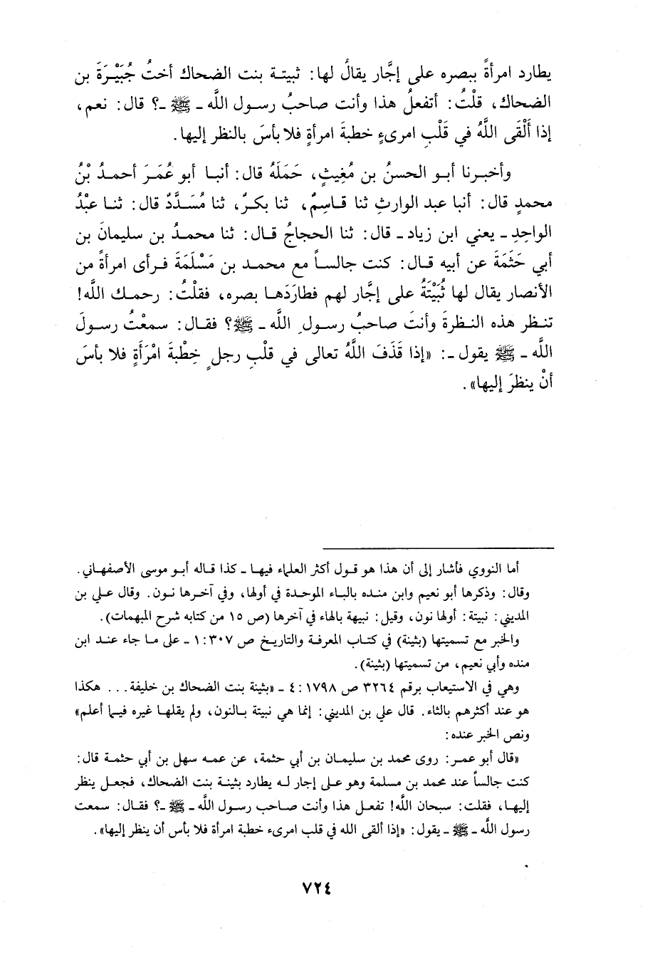 أنبا أَبُو مُحَمَّدِ بْنُ عَتَّابٍ حَمَلَهُ عَلَى أَبِي عَبْدِ اللَّهِ مُحَمَّدِ بْنِ عَابِدٍ قَالَ أنبا ابْنُ مُفَرِّجٍ الْقَاضِي قَالَ أنبا ابْنُ الأَعْرَابِيِّ قَالَ ثَنَا أَبُو يَعْقُوبُ الدَّبَرِيُّ عَنْ عَبْدِ الرَّزَّاقِ عَنْ يَحْيَى بْنِ الْعَلاءِ عَنِ الْحَجَّاجِ بْنِ أَرْطَأَةَ عَن مُحَمَّد ابْن عُثْمَانَ عَنْ سَهْلِ بْنِ أَبِي حَثْمَةَ قَالَ مَرَّ نَاسٌ مِنَ الأَنْصَارِ بمُحَمَّدِ بْنِ مَسْلَمَةَ وَهُوَ يُطَالِعُ جَارِيَةً مِنْ بَنِي النَّجَّارِ فَقَالُوا سُبْحَانَ اللَّهِ لَوْ فَعَلَ هَذَا بَعْضُ شَبَابْنَا رَأَيْنَاهُ قَبِيحًا قَالَ إِنِّي سَمِعْتُ رَسُولَ اللَّهِ صَلَّى اللَّهُ عَلَيْهِ وَسَلَّمَ يَقُولُ إِذَا أَلْقَى اللَّهُ فِي قَلْبِ امْرِئٍ خِطْبَةَ امْرَأَةٍ فَلا بَأْسَ أَنْ يَنْظُرَ إِلَيْهَا
