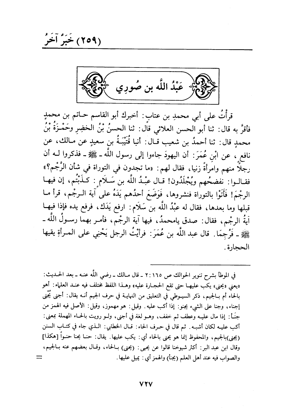 الْحُجَّةُ فِي ذَلِك مَا قَرَأْتُ بِخَطِّ أَبِي الْوَلِيدِ بْنِ الْفَرَضِيِّ قَالَ أنبا ابْنُ مُفَرِّجٍ قَالَ ثَنَا حَثْمَةُ بْنُ سُلَيْمَانَ قَالَ أنبا مُحَمَّدُ بْنُ إِسْمَاعِيلَ عَنْ هِشَامِ بْنِ سَعْدٍ عَنْ زَيْدِ بْنِ أَسْلَمَ عَنْ عَطَاءِ بْنِ يَسَارٍ عَنْ أَبِي سَعِيدٍ الْخُدْرِيِّ قَالَ خَرَجَ النَّبِيِّ صَلَّى اللَّهُ عَلَيْهِ وَسَلَّمَ فِي سَنَةِ سِتٍّ مُعْتَمِرًا فَقَلَّدَ الْهَدْيَ بِذِي الْحُلَيْفَةِ وَأَشْعَرَهُ وَعَقَدَ أَكثر أَصْحَابه شُعُورهمْ والبدوا رُءُوسَهُمْ وَسَاقُوا الْهَدْيَ وَلَمْ يُخْرِجُوا مِنَ السِّلاحِ إِلا مَا يَحْمِلُ الْمُسَافِرُ وَأَحْرَمَ رَسُولُ اللَّهِ صَلَّى اللَّهُ عَلَيْهِ وَسَلَّمَ وَمَضَى وَبَعَثَ بَيْنَ يَدَيْهِ عَيْنًا لَهُ مِنْ خُزَاعَةَ يُقَالُ لَهُ بُسْرُ بْنُ سُفْيَانَ وَمَضَى رَسُولُ اللَّهِ صَلَّى اللَّهُ عَلَيْهِ وَسَلَّمَ فِي أَرْبَعَ عَشْرَةَ مِائَةٍ حَتَّى إِذَا كَانَ بِغَدِيرٍ يُقَالُ لَهُ الأَشْطَاطُ قَرِيبًا مِنْ عُسْفَانَ أَتَاهُ الْخُزَاعِيُّ بِمَرٍّ فَقَالَ يَا رَسُولَ اللَّهِ إِنِّي تركت قَوْمك كَعْب ابْن لؤَي وعَامر بْنَ لُؤَيٍّ قَدْ جَمَعُوا لَكَ الأَحَابِيشَ وَلَبِسُوا جُلُودَ النُّمُورِ فَذَكَرَ الحَدِيث بِطُولِهِ