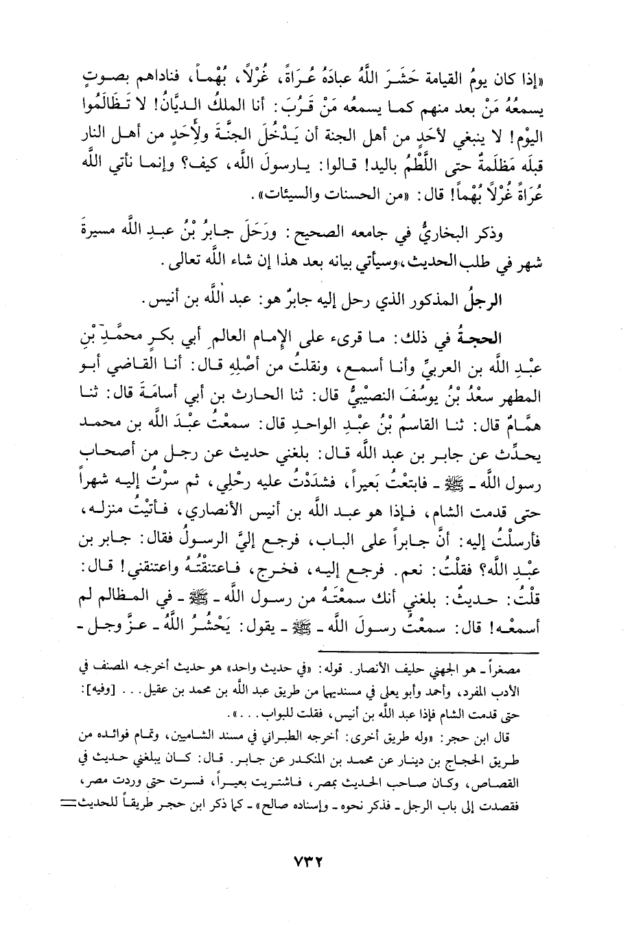 قُرِئَ عَلَى أَبِي بَحْرٍ سُفْيَانَ بْنِ الْعَاصِي الأَسَدِيِّ وَأَنَا شَاهِدٌ سَامِعٌ قَالَ أنبا أَبُو الْفَتْحِ نَصْرُ بْنُ الْحَسَنِ قَالَ أنبا أَبُو مَكِّيٍّ أَحْمَدُ بْنُ ثَابِتٍ الْحَافِظُ قَالَ أَنا عَلِيُّ بْنُ أَحْمَدَ بْنِ عُمَرَ الْمُقْرِي أَنا مُحَمَّدُ بْنُ عَبْدِ اللَّهِ بْنِ إِبْرَاهِيمَ الشَّافِعِيُّ ثَنَا مُعَاذُ بْنُ الْمُثَنَّى ثَنَا مُسَدَّدٌ ثَنَا عَبْدُ الْوَارِثِ عَنِ الْقَاسِم عَن عَبْدِ الْوَاحِدِ عَنْ عَبْدِ اللَّهِ بْنُ مُحَمَّدِ بْنِ عُقَيْلٍ عَنْ جَابِرِ بْنِ عَبْدِ اللَّهِ قَالَ بَلَغَنِي حَدِيثٌ عَنْ رَجُلٍ مِنْ أَصْحَابُ رَسُولِ اللَّهِ صَلَّى اللَّهُ عَلَيْهِ وَسَلَّمَ فَاشْتَرَيْتُ بَعِيرًا فَشَدَدْتُ عَلَيْهِ رَحْلا ثُمَّ سِرْتُ إِلَيْهِ شَهْرًا حَتَّى قَدِمْتُ مِصْرَ قَالَ فَخَرَجَ إِلَيَّ غُلامٌ أَسْوَدُ فَقُلْتُ اسْتَأْذِنْ لِي عَلَى فُلانٍ قَالَ فَدَخَلَ فَقَالَ إِنَّ أَعْرَابِيًّا بِالْبَابِ يَسْتَأْذِنُ قَالَ فَأَخْرُجْ إِلَيْهِ فَقُلْ لَهُ مَنْ أَنْتَ قَالَ لَهُ أَخْبِرْهُ أَنِّي جَابِرُ بْنُ عَبْدِ اللَّهِ قَالَ فَخَرَجَ إِلَيْهِ فَالْتَزَمَ كُلُّ وَاحِدٍ مِنْهُمَا صَاحِبَهُ قَالَ فَقَالَ مَا جَاءَ بِكَ قَالَ حَدِيثٌ بَلَغَنِي أَنَّكَ تُحَدِّثُ بِهِ عَنْ رَسُولِ اللَّهِ صَلَّى اللَّهُ عَلَيْهِ وَسَلَّمَ فِي الْقَصَاصِ مَا أَعْلَمُ أَنَّ أَحَدًا يَحْفَظُهُ غَيْرُكَ وَأَحْبَبْتُ أَنْ تُذَكِّرَنِيهِ قَالَ نَعَمْ سَمِعْتُ رَسُولَ اللَّهِ صَلَّى اللَّهُ عَلَيْهِ وَسلم يَقُول