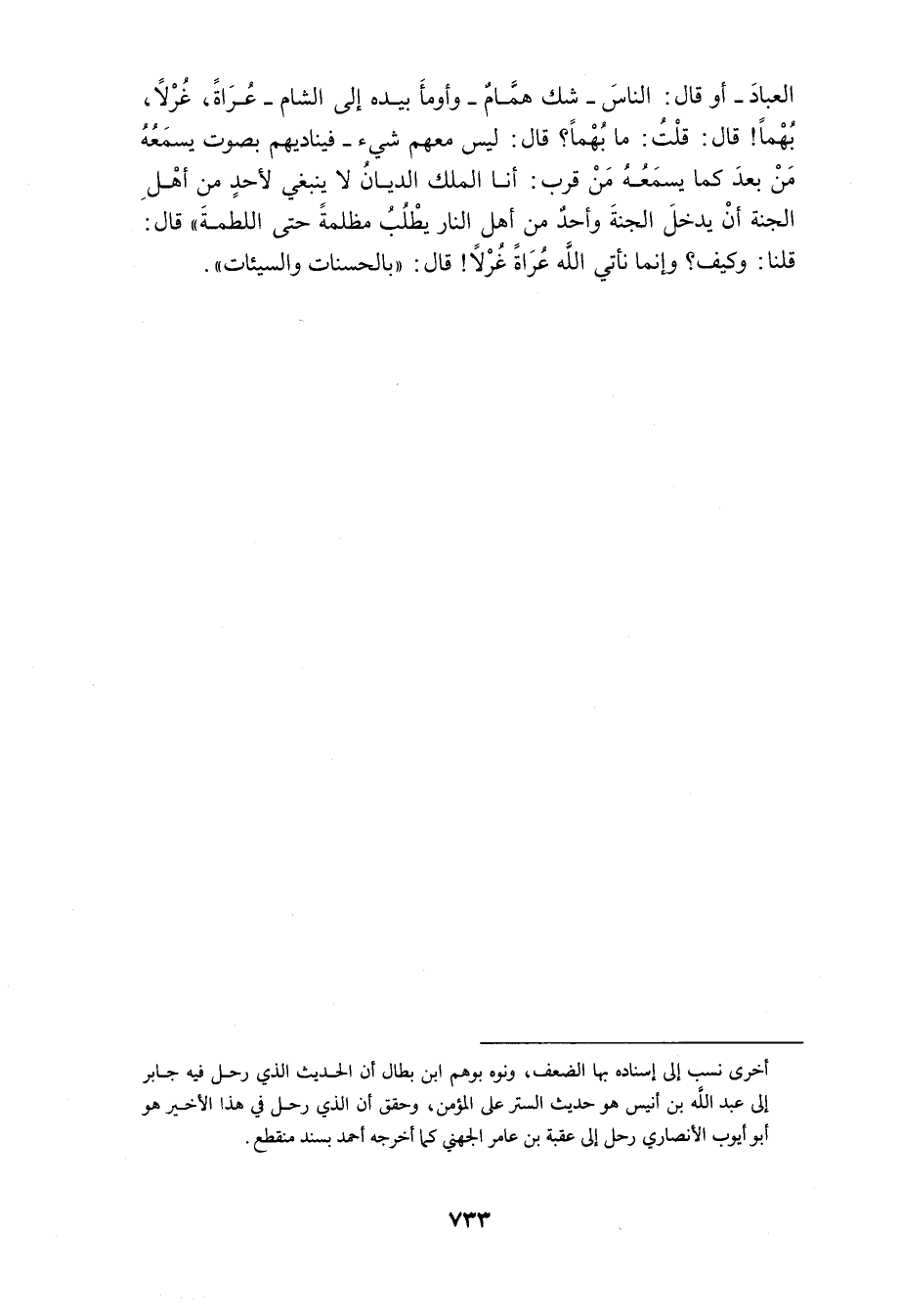 الْحُجَّةُ فِي ذَلِكَ مَا قُرِئَ عَلَى الإِمَامِ الْعَالِمِ أَبِي بَكْرٍ مُحَمَّدِ بْنِ عَبْدِ اللَّهِ بْنِ الْعَرَبِيِّ وَأَنَا أَسْمَعُ وَنَقَلْتُ مِنْ أَصْلِهِ قَالَ أَنا الْقَاضِي أَبُو الْمُطَهَّرِ سَعْدُ بْنُ يُوسُفَ النَّصِيبِيُّ قَالَ ثَنَا الْحَارِثُ بْنُ أَبِي أُسَامَةَ قَالَ ثَنَا هَمَّامٌ قَالَ ثَنَا الْقَاسِمُ بْنُ عَبْدِ الْوَاحِدِ قَالَ سَمِعْتُ عبد الله بن مُحَمَّد يحث عَنْ جَابِرِ بْنِ عَبْدِ اللَّهِ قَالَ بَلَغَنِي حَدِيثٌ عَنْ رَجُلٍ مِنْ أَصْحَابِ رَسُولِ اللَّهِ صَلَّى اللَّهُ عَلَيْهِ وَسَلَّمَ فَابْتَعْتُ بَعِيرًا فَشَدَدْتُ عَلَيْهِ رَحْلِي ثُمَّ سِرْتُ إِلَيْهِ شَهْرًا حَتَّى قَدِمْتُ الشَّامَ فَإِذَا هُوَ عَبْدُ اللَّهِ بْنُ أُنَيْسٍ الأَنْصَارِيُّ فَأَتَيْتُ مَنْزِلَهُ فَأَرْسَلْتُ إِلَيْهِ أَنَّ جَابِرًا عَلَى الْبَابِ فَرَجَعَ إِلَى الرَّسُولِ فَقَالَ جَابِرُ بْنُ عَبْدِ اللَّهِ فَقُلْتُ نَعَمْ فَرَجَعَ إِلَيْهِ فَخَرَجَ فَاعْتَنَقْتُهُ وَاعْتَنَقَنِي قَالَ قُلْتُ حَدِيثً بَلَغَنِي أَنَّكَ سَمِعْتَهُ مِنْ رَسُولِ اللَّهِ صَلَّى اللَّهُ عَلَيْهِ وَسَلَّمَ فِي الْمَظَالِمِ لَمْ أَسْمَعْهُ قَالَ سَمِعْتُ رَسُولَ اللَّهِ صَلَّى اللَّهُ عَلَيْهِ وَسَلَّمَ يَقُولُ يَحْشُرُ اللَّهُ عَزَّ وَجَلَّ