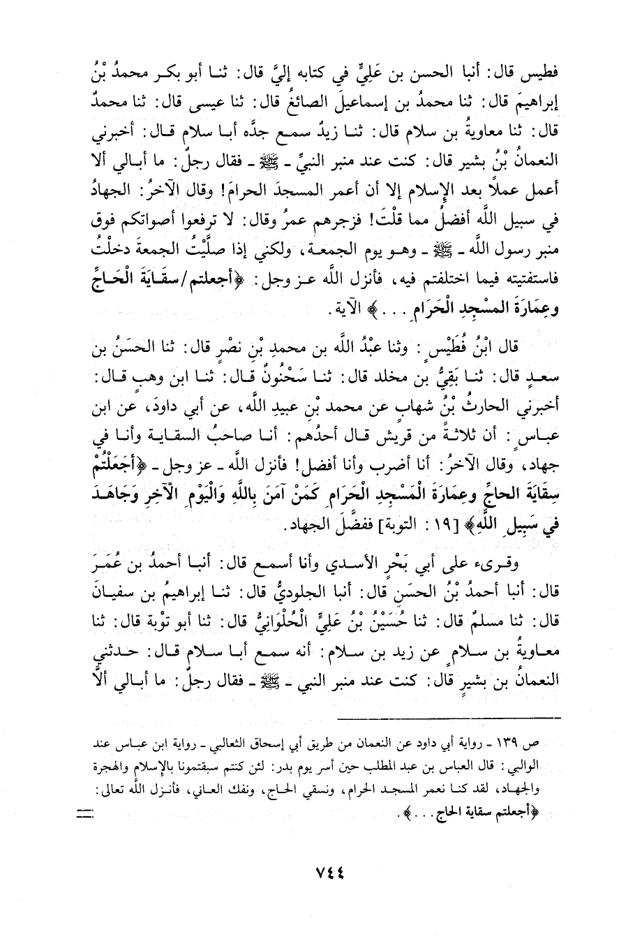 قَرَأْتُ عَلَى أَبِي مُحَمَّدِ بْنِ عَتَّابٍ أَخْبَرَكَ أَبُوكَ رَحِمَهُ اللَّهُ فَأَقَرَّ بِهِ قَالَ أنبا عَبْدُ الرَّحْمَنِ بْنِ أَحْمَدَ قَالَ ثَنَا إِسْمَاعِيلَ بْنِ بَدْرٍ قَالَ ثَنَا الْخُشَنِيُّ قَالَ ثَنَا سَلَمَةُ بْنُ شَبِيبٍ عَنْ عَبْدِ الرَّزَّاقِ عَنْ مَعْمَرٍ عَنْ يَحْيَى بْنِ أَبِي كَثِيرٍ عَنْ رَجُلٍ عَنِ النُّعْمَانِ بْنِ بَشِيرٍ أَنَّ رَجُلا قَالَ مَا أُبَالِي أَلا أَعْمَلَ عَمَلا بَعْدَ الإِسْلامِ إِلا أَنْ أَسْقِيَ الْحَاجَّ وَقَالَ آخَرُ مَا أُبَالِي أَلا أَعْمَلَ عَمَلا بَعْدَ الإِسْلامِ إِلا أَنْ أَعْمُرَ الْمَسْجِدَ الْحَرَامِ وَقَالَ آخَرُ الْجِهَادُ فِي سَبِيلِ الله أفضل مِمَّا قاتما فَزَجَرَهُمْ عُمَرُ فَقَالَ لَا تَرْفَعُوا أَصْوَاتَكُمْ عِنْدَ مِنْبَرِ رَسُولِ اللَّهِ صَلَّى اللَّهُ عَلَيْهِ وَسَلَّمَ وَذَلِكَ يَوْمُ الْجُمُعَةِ وَلَكِنْ إِذَا صَلَّى رَسُولِ اللَّهِ صَلَّى اللَّهُ عَلَيْهِ وَسَلَّمَ دَخَلْنَا عَلَيْهِ فَنَزَلَتْ {أَجَعَلْتُمْ سِقَايَةَ الْحَاجِّ وَعِمَارَةَ الْمَسْجِدِ الْحَرَامِ كَمَنْ آمَنَ بِاللَّهِ وَالْيَوْمِ الآخِرِ وَجَاهَدَ فِي سَبِيلِ اللَّهِ لَا يَسْتَوُونَ عِنْدَ اللَّهِ} 196 التَّوْبَة