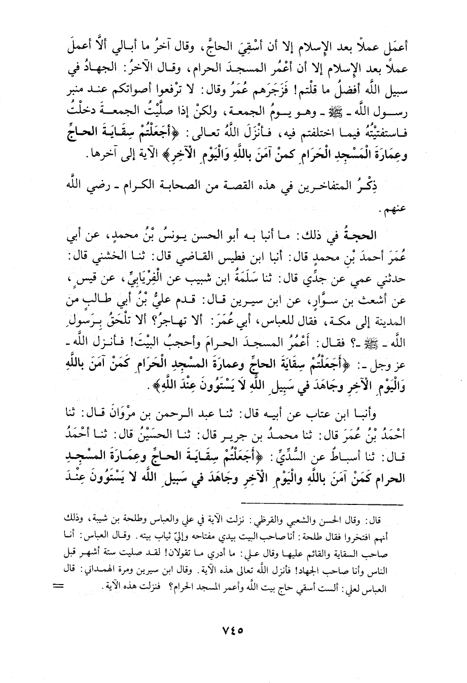 فُطَيْسٍ قَالَ أنبا الْحَسَنُ بْنُ عَلِيٍّ فِي كِتَابِهِ إِلَيَّ قَالَ ثَنَا أَبُو بَكْرٍ مُحَمَّدُ بْنُ إِبْرَاهِيمَ قَالَ ثَنَا مُحَمَّدُ بْنُ إِسْمَاعِيلَ الصَّائِغُ قَالَ ثَنَا عِيسَى قَالَ ثَنَا مُحَمَّدٌ قَالَ ثَنَا مُعَاوِيَةُ بْنُ سَلامٍ قَالَ ثَنَا زَيْدٌ سَمِعَ جَدَّهُ أَبَا سَلامٍ قَالَ أَخْبَرَنِي النُّعْمَانُ بْنُ بَشِيرٍ قَالَ كُنْتُ عِنْدَ مِنْبَرِ النَّبِيِّ صَلَّى اللَّهُ عَلَيْهِ وَسَلَّمَ فَقَالَ رَجُلٌ مَا أُبَالِي أَلا أَعْمَلَ عَمَلا بَعْدَ الإِسْلامِ إِلا أَنْ أَعْمُرَ الْمَسْجِدَ الْحَرَامِ وَقَالَ آخَرُ الْجِهَادُ فِي سَبِيلِ اللَّهِ أَفْضَلُ مِمَّا قُلْتَ فَزَجَرَهُمْ عُمَرُ وَقَالَ لَا تَرْفَعُوا أَصْوَاتَكُمْ فَوْقَ مِنْبَرِ رَسُولِ اللَّهِ صَلَّى اللَّهُ عَلَيْهِ وَسَلَّمَ وَهُوَ يَوْمُ الْجُمُعَةِ وَلَكِنِّي إِذا صليت الْجُمُعَة دخلت فاسفتيته فِيمَا اخْتَلَفْتُمْ فِيهِ فَأَنْزَلَ اللَّهُ عَزَّ وَجَلَّ {أَجَعَلْتُمْ سِقَايَةَ الْحَاجِّ وَعمارَة الْمَسْجِد الْحَرَام} الآيَةَ