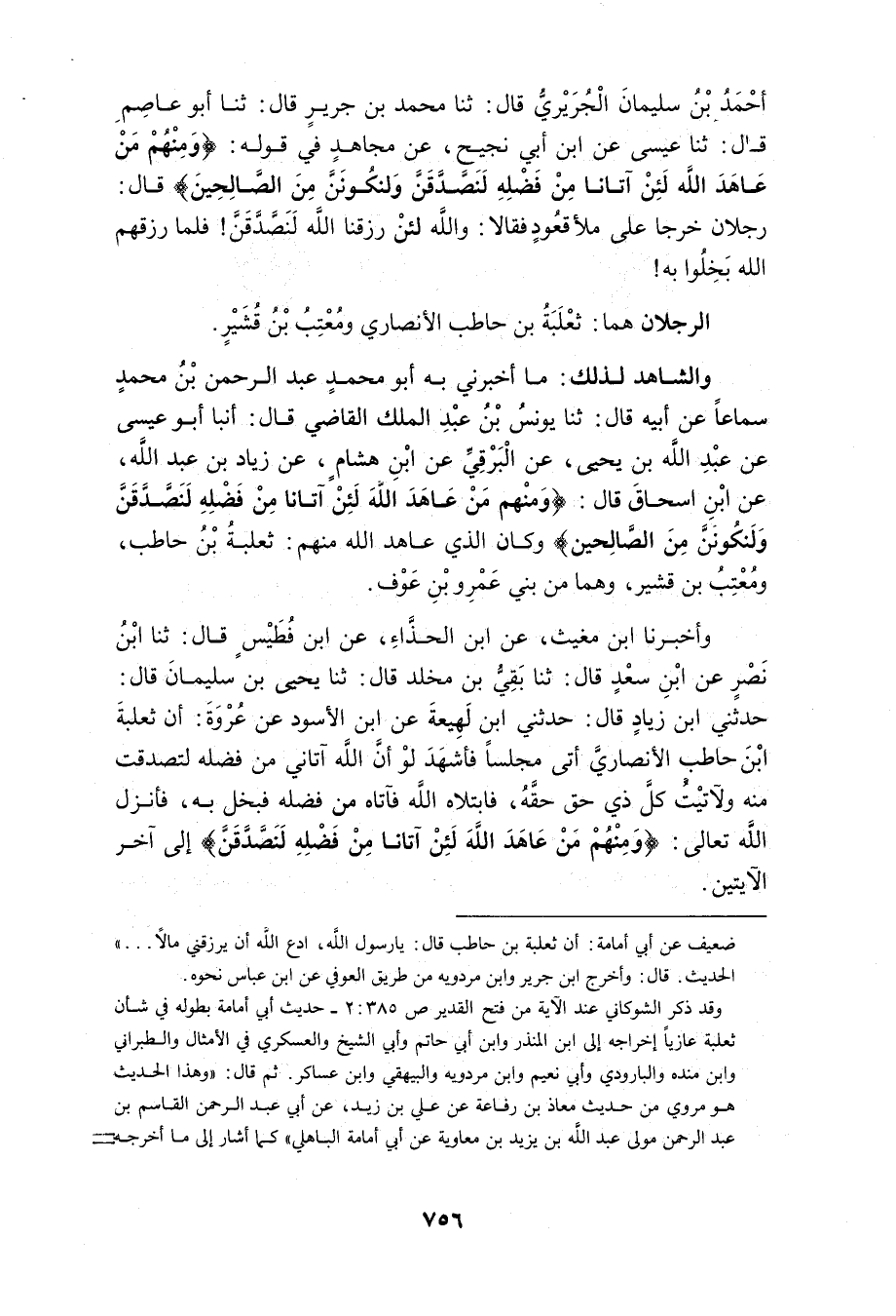أنبا أَبُو مُحَمَّدِ بْنُ عَتَّابٍ عَنْ أَبِي عُمَرَ النَّمِرِيِّ قَالَ ثَنَا خَلَفُ بْنُ قَاسِمٍ قَالَ ثَنَا مُحَمَّدُ بْنُ أَحْمَدَ بْنِ الْمِسْوَرِ وَبُكَيْرُ بْنُ الْحَسَنِ قَالا ثَنَا الْقَرَاطِيسِيُّ قَالَ ثَنَا أَسَدٌ قَالَ ثَنَا الْوَلِيدُ بْنُ مُسْلِمٍ عَنْ خُلَيْدٍ عَنْ قَتَادَةَ أَنَّ هَذِهِ الآيَةَ {وَمِنْهُمْ مَنْ عَاهَدَ اللَّهَ لَئِنْ آتَانَا مِنْ فَضْلِهِ} 75 التَّوْبَة نَزَلَتْ فِي رَجُلٍ مِنَ الأَنْصَارِ عَاهَدَ اللَّهَ عَهْدًا فَأَسَاءَ عَهْدَهُ