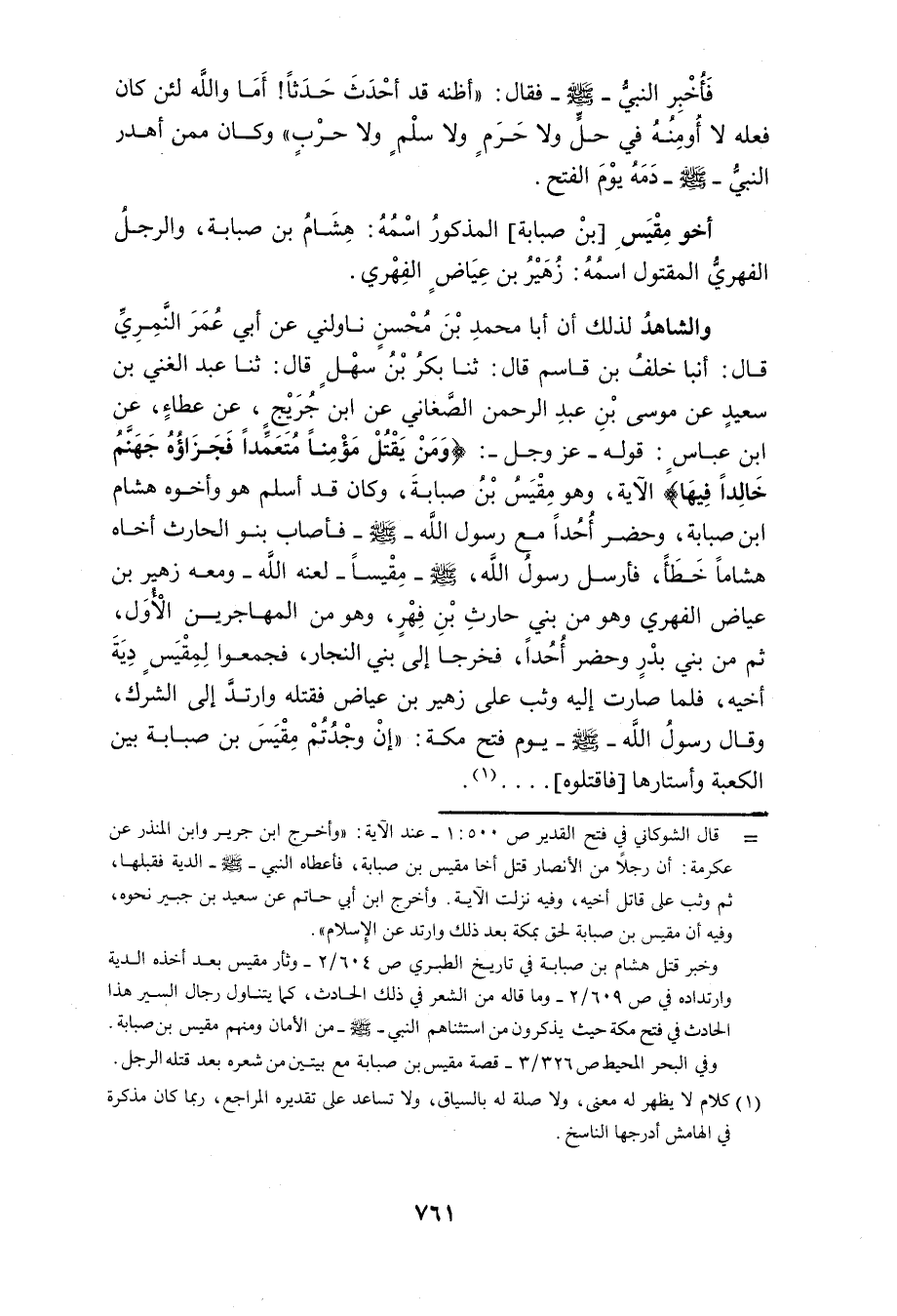 أنبا أَبُو الْحَسَنِ بن مفيث عَنْ أَبِي عُمَرَ أَحْمَدَ بْنِ مُحَمَّدٍ قَالَ ثَنَا ابْنُ فُطَيْسٍ وَمِنْ خَطِّهِ نَقَلْتُهُ قَالَ ثَنَا الْخُشَنِيُّ قَالَ ثَنَا الْحَسَنُ بْنُ سَعِيدٍ قَالَ ثَنَا عَلِيُّ بْنُ الْمُبَارَكِ قَالَ ثَنَا زَيْدُ بْنُ الْمُبَارَكِ قَالَ ثَنَا مُحَمَّدُ بْنُ ثَوْرٍ عَنِ ابْنِ جُرَيْجٍ {وَمَنْ يَقْتُلْ مُؤْمِنًا مُتَعَمِّدًا فَجَزَاؤُهُ جَهَنَّمُ خَالِدًا فِيهَا} 93 النِّسَاء نَزَلَتْ فِي مِقْيَسِ بْنِ صُبَابَةَ بْنِ عُبَيْدِ بْنِ عَبْدِ بْنِ كُلَيْبِ بْنِ لَيْثِ بْنِ بَكْرِ بْنِ كِنَانَةَ قَتَلَ أَخَاهُ رَجُلٌ فَأَعْطَاهُ النَّبِيُّ صَلَّى اللَّهُ عَلَيْهِ وَسَلَّمَ الدِّيَةَ ثُمَّ بَيَّتَ قَاتِلَ أَخِيهِ فَقَتَلَهُ قَالَ ابْنُ جُرَيْجٍ وَقَالَ آخَرُونَ ضَرَبَ النَّبِيُّ صَلَّى اللَّهُ عَلَيْهِ وَسَلَّمَ دِيَةَ أَخِيهِ عَلَى رَهْطِ الَّذِي قَتَلَ عَلَى الأَنْصَارِ ثُمَّ بَعَثَهُ النَّبِيُّ صَلَّى اللَّهُ عَلَيْهِ وَسَلَّمَ فَرَأَى رَجُلا مِنْ بَنِي فِهْرٍ فِي بَعْضِ أَمْرِهِ وَكَانَ رَجُلا أَيِّدًا فَاحْتَمَلَ الْفِهْرِيَّ ثُمَّ رَضَحَ رَأْسَهُ بَيْنَ حَجَرَيْنِ ثُمَّ كَفَأَ يَتَغَنَّى ... قَتَلْتُ بِهِ فِهْرًا وجملت عَقْلَهُ ... سَرَاةَ بَنِي النَّجَّارِ أَرْبَابَ فارغ ...