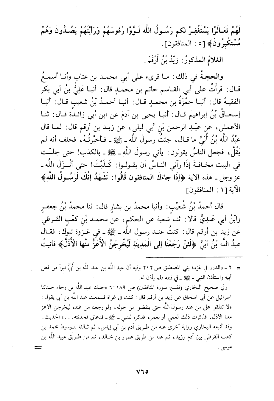 قَرَأْتُ عَلَى أَبِي مُحَمَّدِ بْنِ عَتَّابٍ أَخْبَرَكَ أَبُوكَ رَحِمَهُ اللَّهُ فَأَقَرَّ بِهِ قَالَ أنبا عَبْدُ الرَّحْمَنِ بْنُ أَحْمَدَ قَالَ ثَنَا إِسْمَاعِيلُ بْنُ بَدْرٍ قَالَ ثَنَا الْخُشَنِيُّ قَالَ ثَنَا سَلَمَةَ بْنِ شَبِيبٍ قَالَ ثَنَا عبد الرَّزَّاق قَالَ أنبأ معمر فِي قَوْلِهِ {لَئِنْ رَجَعْنَا إِلَى الْمَدِينَةِ لَيُخْرِجَنَّ الأَعَزُّ مِنْهَا الأَذَلَّ} 8 المُنَافِقُونَ قَالَ قَالَ الْحَسَنُ جَاءَ غُلامٌ إِلَى النَّبِيِّ صَلَّى اللَّهُ عَلَيْهِ وَسَلَّمَ فَقَالَ يَا نَبِيَّ اللَّهِ إِنِّي سَمِعْتُ عَبْدَ اللَّهِ بْنُ أُبَيِّ بْنِ سَلُولٍ يَقُولُ كَذَا وَكَذَا فَقَالَ النَّبِيُّ صَلَّى اللَّهُ عَلَيْهِ وَسَلَّمَ فَلَعَلَّكَ غَضِبْتَ عَلَيْهِ فَقَالَ لَا وَاللَّهِ يَا نَبِيَّ اللَّهِ لَقَدْ سَمِعْتُهُ قَالَ وَلَعَلَّكَ قَدْ شُبِّهَ عَلَيْكَ فَأَنْزَلَ اللَّهُ تَعَالَى تَصْدِيقَ الْغُلامِ {يَقُولُونَ لَئِنْ رَجَعْنَا إِلَى الْمَدِينَةِ لَيُخْرِجَنَّ الْأَعَز مِنْهَا الْأَذَل} فَأَخَذَ رَسُولُ اللَّهِ صَلَّى اللَّهُ عَلَيْهِ وَسَلَّمَ بِأُذُنِ الْغُلامِ فَقَالَ وَفَتْ أُذُنُكَ يَا غُلامُ وَفَتْ أُذُنُكَ يَا غُلامُ