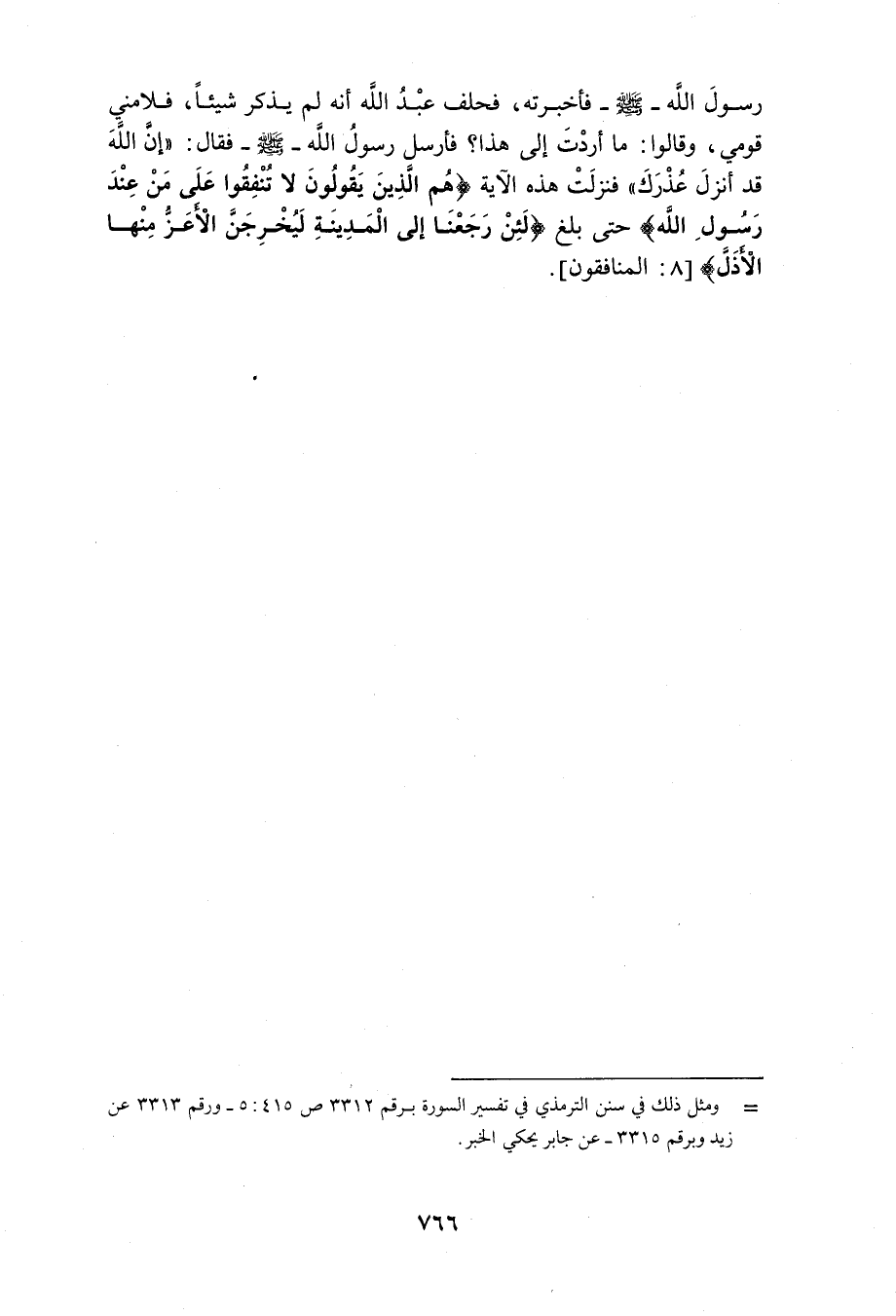 وَالْحُجَّةُ فِي ذَلِكَ مَا قُرِئَ على أبي مُحَمَّد بْن عتاب وَأَنَا أَسْمَعُ قَالَ قَرَأْتُ عَلَى أَبِي الْقَاسِمِ حَاتِمِ بْنِ مُحَمَّدٍ قَالَ أنبا عَلِيُّ بْنُ أَبِي بَكْرٍ الْفَقِيهُ قَالَ أنبا حَمْزَةُ بْنُ مُحَمَّدٍ قَالَ أَنْبَأَ أَحْمَدُ بْنُ شُعَيْبٍ قَالَ أَنْبَأَ إِسْحَاقُ بْنُ إِبْرَاهِيمَ قَالَ أنبا يَحْيَى بْنُ آدَمَ عَنِ ابْنِ أَبِي زَائِدَةَ قَالَ ثَنَا الأَعْمَشُ عَنْ عَبْدِ الرَّحْمَنِ بْنِ أَبِي لَيْلَى عَنْ زَيْدِ بْنِ أَرْقَمَ قَالَ لَمَا قَالَ عَبْدُ اللَّهِ بْنُ أُبَيٍّ مَا قَالَ جِئْتُ رَسُولَ اللَّهِ صَلَّى اللَّهُ عَلَيْهِ وَسَلَّمَ فَأَخْبَرْتُهُ فَحَلَفَ أَنَّهُ لَمْ يَقُلْ فَجَعَلَ النَّاسُ يَقُولُونَ يَأْتِي رَسُولُ اللَّهِ صَلَّى اللَّهُ عَلَيْهِ وَسَلَّمَ بِالْكَذِبِ حَتَّى جَلَسْتُ فِي الْبَيْتِ مَخَافَةَ إِذَا رَآنِي النَّاسُ أَنْ يَقُولُوا كَذَبْتَ حَتَّى أَنْزَلَ اللَّهُ عَزَّ وَجَلَّ هَذِهِ الآيَةَ {إِذَا جَاءَكَ الْمُنَافِقُونَ قَالُوا نَشْهَدُ إِنَّكَ لرَسُول الله} الْآيَة 1 المُنَافِقُونَ