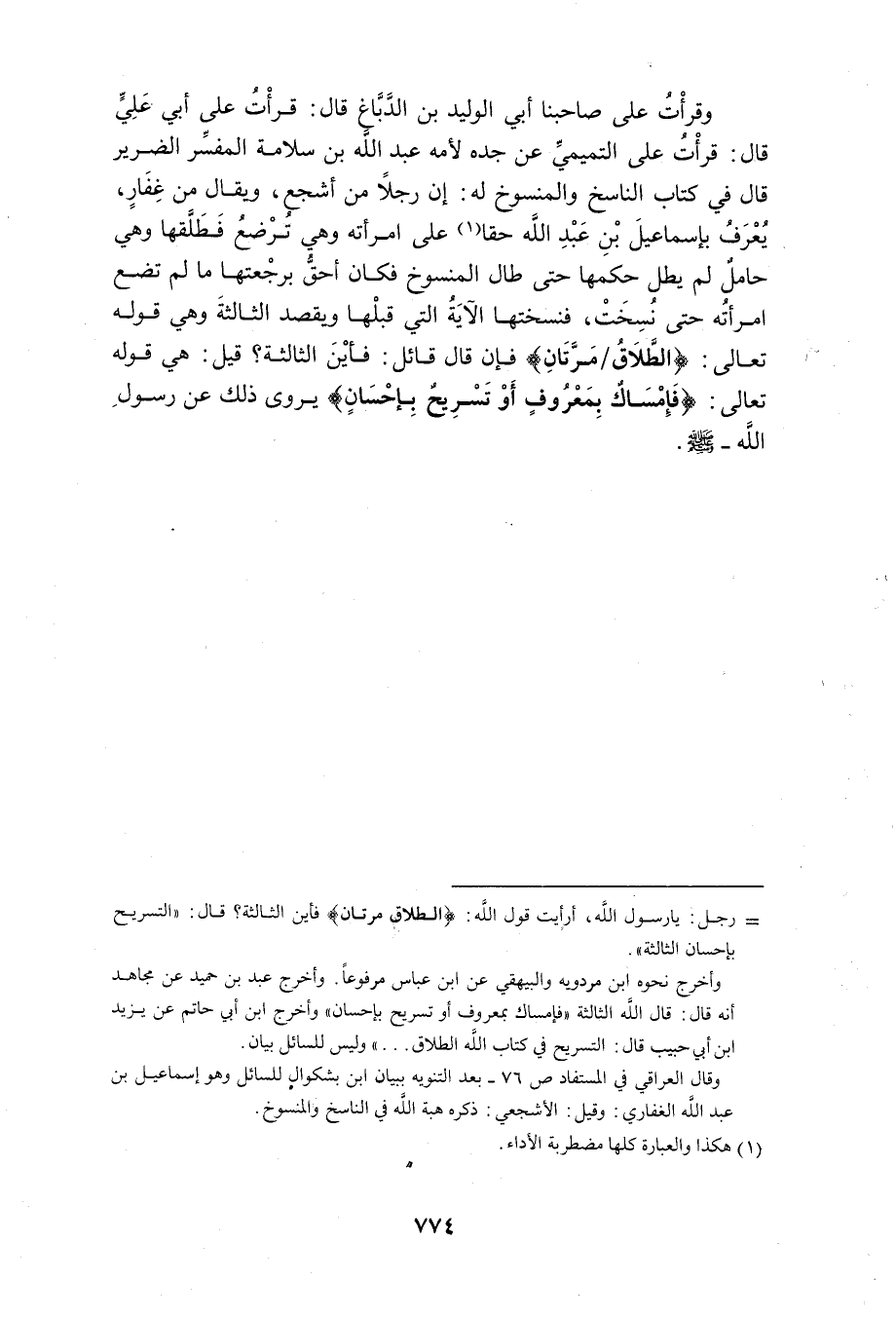قَرَأْتُ عَلَى أَبِي بَكْرٍ مُحَمَّدٍ بْنِ عَبْدِ اللَّهِ أَنا قَدْ أَخْبَرَكَ أَبُو الْحَسَنِ عَلِيُّ بْنُ أَيُّوبَ فَأَقَرَّ بِهِ قَالَ أنبا أَبُو عَلِيِّ بْنُ شَاذَانَ ثَنَا أَحْمَدُ بْنُ سُلَيْمَانَ النَّجَّادُ قَالَ ثَنَا أَبُو دَاوُدَ ثَنَا مُحَمَّدُ بْنُ كَثِيرٍ ثَنَا سُفْيَانُ ثَنَا إِسْمَاعِيلُ بْنُ سُمَيْعٍ قَالَ سَمِعْنَا أَبَا رَزِينٍ الأَسَدِيَّ يَقُولُ جَاءَ رَجُلٌ إِلَى النَّبِيِّ صَلَّى اللَّهُ عَلَيْهِ وَسَلَّمَ فَقَالَ أَرَأَيْتَ قَوْلَ اللَّهِ تَعَالَى {الطَّلاقُ مَرَّتَانِ فَإِمْسَاكٌ بِمَعْرُوفٍ أَوْ تَسْرِيحٌ بِإِحْسَانٍ} 229 الْبَقَرَة قَالَ فَأَيْنَ الثَّالِثَةُ قَالَ تَسْرِيحٌ بِإِحْسَانٍ الثَّالِثَةُ