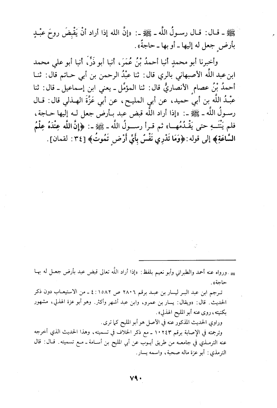 أنبا أَبُو مُحَمَّدِ بْنُ عَتَّابٍ عَنْ حَاتِمِ بْنِ مُحَمَّدٍ قَالَ ثَنَا أَحْمَدُ بْنُ فِرَاسٍ ثَنَا الدِّيلِيُّ مُحَمَّدُ بْنُ إِبْرَاهِيمَ ثَنَا عَبْدُ الْحَمِيدِ بْنُ صبيح ثَنَا حَمَّاد ابْن زَيْدٍ عَنْ أَيُّوبَ عَنْ أَبِي الْمَلِيحِ قَالَ حَدَّثَنِي رَجُلٌ بَيْنَ قَوْمِي وَكَانَتْ لَهُ صُحْبَةٌ قَالَ قَالَ رَسُولُ اللَّهِ صَلَّى اللَّهُ عَلَيْهِ وَسَلَّمَ إِذَا أَرَادَ اللَّهُ قَبْضَ عَبْدٍ بِأَرْضٍ جَعَلَ لَهُ إِلَيْهَا حَاجَةً