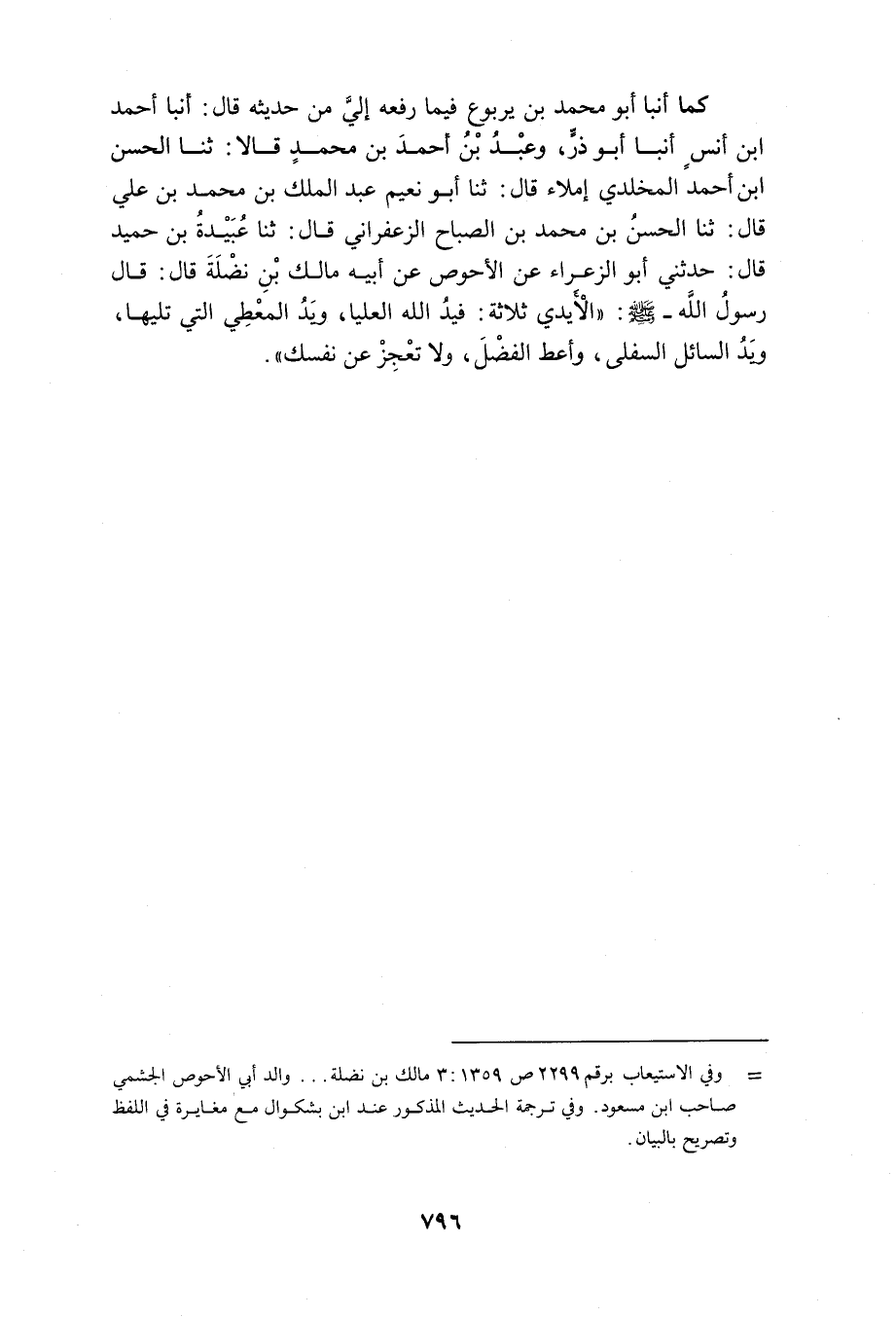 أنبا أَبُو مُحَمَّدِ بْنُ عَتَّابٍ عَنْ أَبِي مُحَمَّدٍ عَبْدِ اللَّهِ بْنِ سَعِيدٍ الْمُجَاوِرَ بِمَكَّةَ قَالَ أَنا أَبُو ذَرٍّ الْهَرَوِيُّ قَالَ أَنا أَبُو الْفَضْلِ بْنُ أَبِي الْقَاسِمِ قَالَ ثَنَا أَحْمَدُ بْنُ نَجْدَةَ قَالَ ثَنَا الْحِمَّانِيُّ قَالَ ثَنَا أَبُو بَكْرٍ وَأَبُو الأَحْوَصِ عَنْ أَبِي إِسْحَاقَ عَنْ أَبِي الأَحْوَصِ عَنْ أَبِيهِ قَالَ رَآنِي النَّبِيُّ صَلَّى اللَّهُ عَلَيْهِ وَسَلَّمَ وَأَنَا رَثُّ الْهَيْأَةِ فَقَالَ مَالِي أَرَاكَ رَثَّ الْهَيْأَةَ أَمَالَكَ مِنْ مَالٍ قَالَ قلت بَلَى قَدْ آتَانِي اللَّهُ مِنْ كُلِّ الْمَالِ قَالَ فَلْيَرَ أَثَرَ نِعْمَةَ اللَّهِ عَلَيْكَ