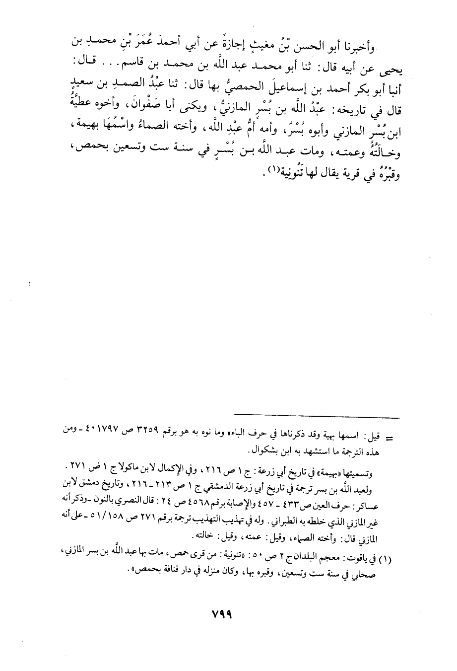 وَالشَّاهِدُ لِذَلِكَ مَا أنبا أَبُو عَبْدِ اللَّهِ مُحَمَّدُ بْنُ أَحْمَدَ الشَّهِيدُ رَحِمَهُ اللَّهُ قَالَ قَرَأْتُ عَلَى أَبِي عَلِيٍّ الْحِمَّانِيِّ أَخْبَرَكُمْ أَبُو عُمَرَ النَّمَرِيُّ الدِّمَشْقِيُّ قَالَ ثَنَا أَبُو زُرْعَةَ عَبْدُ الرَّحْمَنِ بْنُ عَمْرٍو الدِّمَشْقِيُّ قَالَ ثَنَا يَحْيَى بْنُ صَالِحٍ الْوُحَاظِيُّ أَنَّهُ سَمِعَ مُحَمَّدَ بْنَ الْقَاسِمِ الطَّائِيَّ يَقُولُ أُخْتُ عَبْدِ اللَّهِ بْنِ بُسْرٍ اسْمُهَا بَهِيَّةُ قَالَ أَبُو زُرْعَةَ وَقَالَ لِي دُحَيْمٌ أَهْلُ بَيْتِ أَرْبَعَةٌ صَحِبُوا النَّبِيَّ صَلَّى اللَّهُ عَلَيْهِ وَسَلَّمَ بُسْرٌ وَابْنَاهُ عَبْدُ اللَّهِ وَعَطِيَّةُ وَابْنَتُهُ أَخْتُهُمَا الصَّمَّاءُ وَذَكَرَ الدَّارَقُطْنِيُّ أَنَّ الصَّمَّاءَ بِنْتَ بُسْرٍ اسْمُهَا بَهِيمَةُ بِزِيَادَةِ مِيمٍ رَوَتْ عَنِ النَّبِيِّ صَلَّى اللَّهُ عَلَيْهِ وَسَلَّمَ أَنَّهُ نَهَى عَنْ صِيَامِ يَوْمِ السَّبْتِ إِلا فِي فَرِيضَةٍ وَرَوَى عَنْهَا أَخُوهَا عَبْدُ اللَّهِ بْنُ بُسْرٍ اسْمُهَا بَهِيمَةُ وَهِيَ الصَّمَّاءُ وَقَالَ ثَنَا مُحَمَّدُ بْنُ إِسْمَاعِيلَ قَالَ ثَنَا أَبُو زُرْعَةَ الدِّمَشْقِيُّ قَالَ حَدَّثَنِي يَحْيَى بْنُ صَالِحٍ أَنَّهُ سَمِعَ مُحَمَّدَ بْنَ الْقَاسِمِ الطَّائِيَّ أَنَّ أُخْتَ عَبْدِ اللَّهِ بْنُ بُسْرٍ اسْمُهَا بَهِيمَةُ وَهِي الصماء