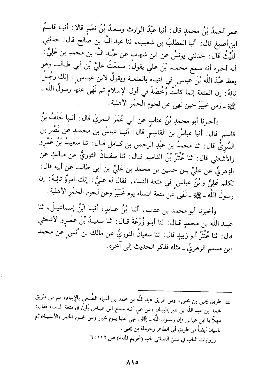 وَقُرِئَ عَلَى أَبِي بَحْرٍ سُفْيَانَ بْنِ الْعَاصِي الأَسَدِيِّ وَأَنَا أَسْمَعُ قَالَ أَنْبَأَ أَحْمَدُ بْنُ عُمَرَ الْعُذْرِيُّ قَالَ أنبا أَبُو الْعَبَّاسِ الرَّازِيُّ قَالَ أنبا أَبُو أَحْمَدَ الْجَلُودِيُّ قَالَ أنبا إِبْرَاهِيمُ بْنُ مُحَمَّدٍ قَالَ ثَنَا مُسْلِمُ بْنُ حَجَّاجٍ قَالَ ثَنَا يَحْيَى بْنُ يَحْيَى قَالَ قَرَأْتُ عَلَى مَالِكٍ عَنِ ابْنِ شِهَابٍ عَنْ عَبْدِ اللَّهِ وَالْحَسَنِ ابْنَيْ مُحَمَّدِ بْنِ عَلِيٍّ عَنْ أَبِيهِمَا عَنْ عَلِيِّ بْنِ أَبِي طَالِبٍ أَنَّ رَسُولَ اللَّهِ صَلَّى اللَّهُ عَلَيْهِ وَسَلَّمَ نَهَى عَنْ مُتْعَةَ النِّسَاءِ يَوْمَ خَيْبَرَ وَعَنْ أَكْلِ لُحُومِ الْحُمُرِ الإِنْسِيَّةِ قَالَ مُسْلِمٌ وَثنا عَبْدُ اللَّهِ بْنُ مُحَمَّدِ بْنِ أَسْمَاءَ الضُّبَعِيُّ ثَنَا جُوَيْرِيَةُ عَنْ مَالِكٍ بِهَذَا الإِسْنَادِ وَقَالَ سَمِعَ عَلِيَّ بْنَ أَبِي طَالِبٍ يَقُولُ لِفُلانٍ إِنَّكَ رَجُلٌ تَائِهٌ نَهَى رَسُولُ اللَّهِ صَلَّى اللَّهُ عَلَيْهِ وَسَلَّمَ بِمِثْلِ حَدِيثِ يَحْيَى عَنْ مَالِكٍ