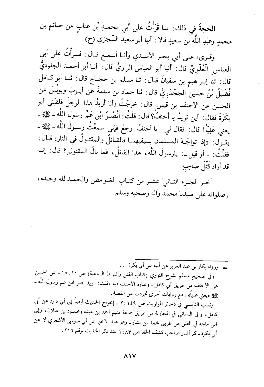 وَقُرِئَ على أبي مُحَمَّد بْن عتاب غَيْرَ مَرَّةٍ وَأَنَا أَسْمَعُ قَالَ قَرَأْتُ عَلَى خَلَفِ بْنِ مُحَمَّدٍ قَالَ أَنْبَأَ أَبُو الْحَسَنِ عَلِيُّ بْنُ مُحَمَّدٍ الْقَابِسِيُّ قَالَ أنبا أَبُو زَيْدٍ الْمَرْوَزِيُّ قَالَ ثَنَا مُحَمَّدُ بْنُ يُوسُفَ قَالَ ثَنَا مُحَمَّدِ بْنِ إِسْمَاعِيلَ قَالَ ثَنَا عَبْدُ الرَّحْمَنِ بْنُ الْمُبَارَكِ قَالَ ثَنَا حَمَّادُ بْنُ زَيْدٍ قَالَ ثَنَا أَيُّوبُ وَيُونُسُ عَنِ الْحَسَنِ عَنِ الأَحْنَفِ بْنِ قَيْسٍ ذَهَبْتُ لأَنْصُرَ هَذَا الرَّجُلَ فَلَقِيَنِي أَبُو بَكْرَةَ فَقَالَ أَيْنَ تُرِيدَ قُلْتُ أَنْصُرَ هَذَا الرَّجُلَ قَالَ ارْجَعْ فَإِنِّي سَمِعْتُ رَسُولَ اللَّهِ صَلَّى اللَّهُ عَلَيْهِ وَسَلَّمَ يَقُولُ إِذَا الْتَقَى الْمُسْلِمَانِ بِسَيْفَيْهِمَا فَالْقَاتِلُ وَالْمَقْتُولُ فِي النَّارِ فَقُلْتُ يَا رَسُولَ اللَّهِ هَذَا الْقَاتِلُ فَمَا بَالُ الْمَقْتُولُ قَالَ إِنَّهُ كَانَ حَرِيصًا عَلَى قَتْلِ صَاحِبِهِ